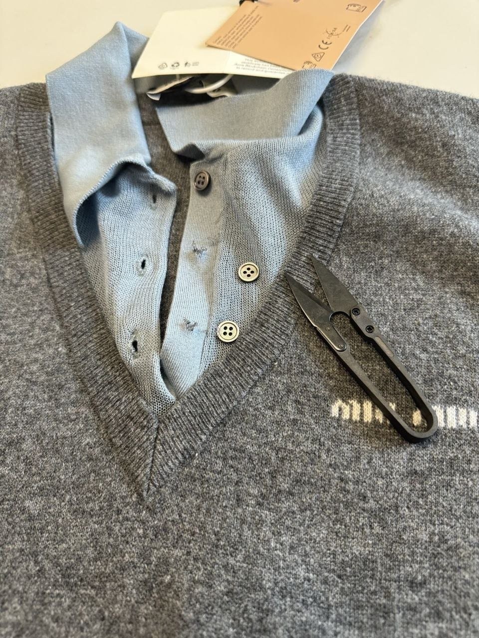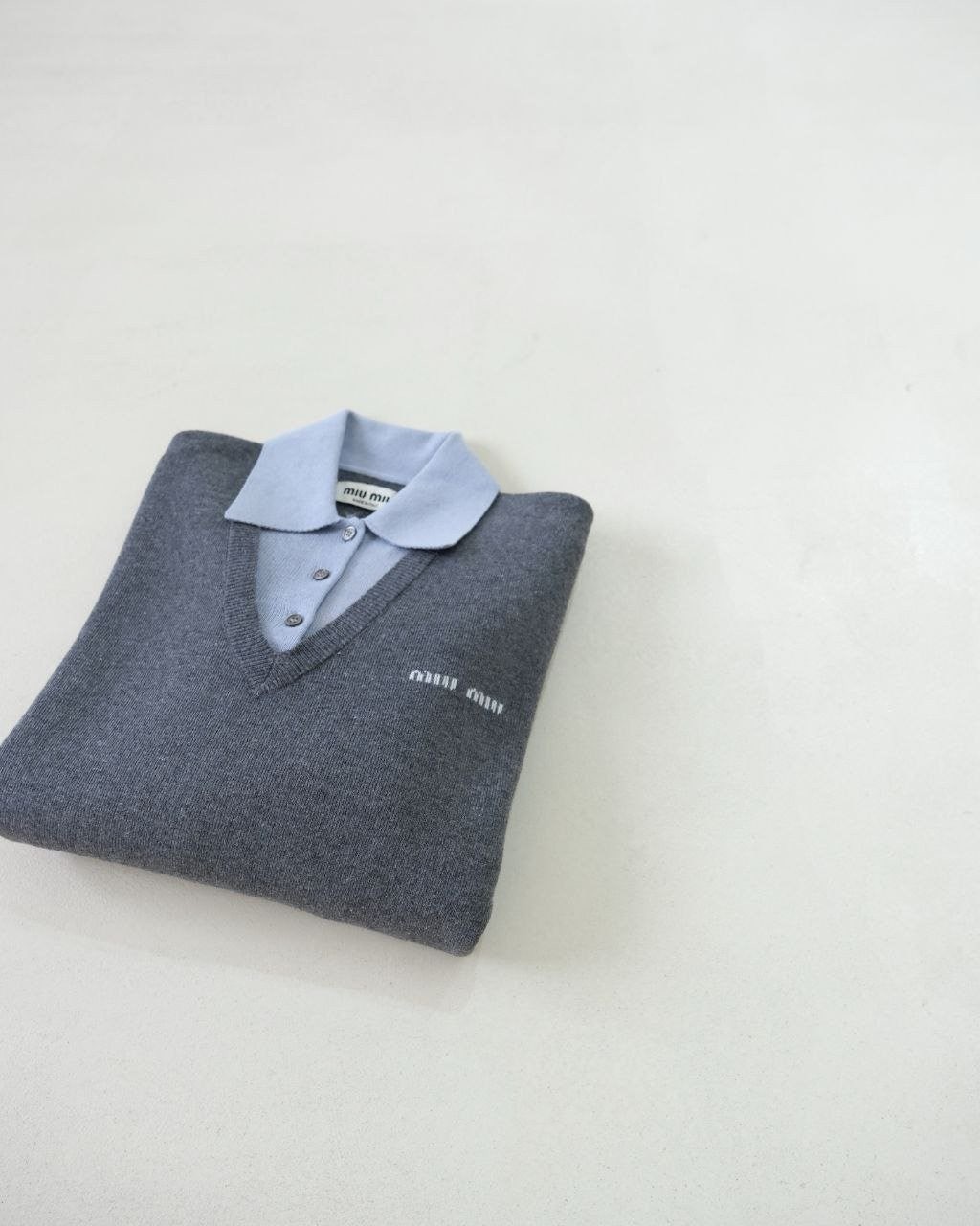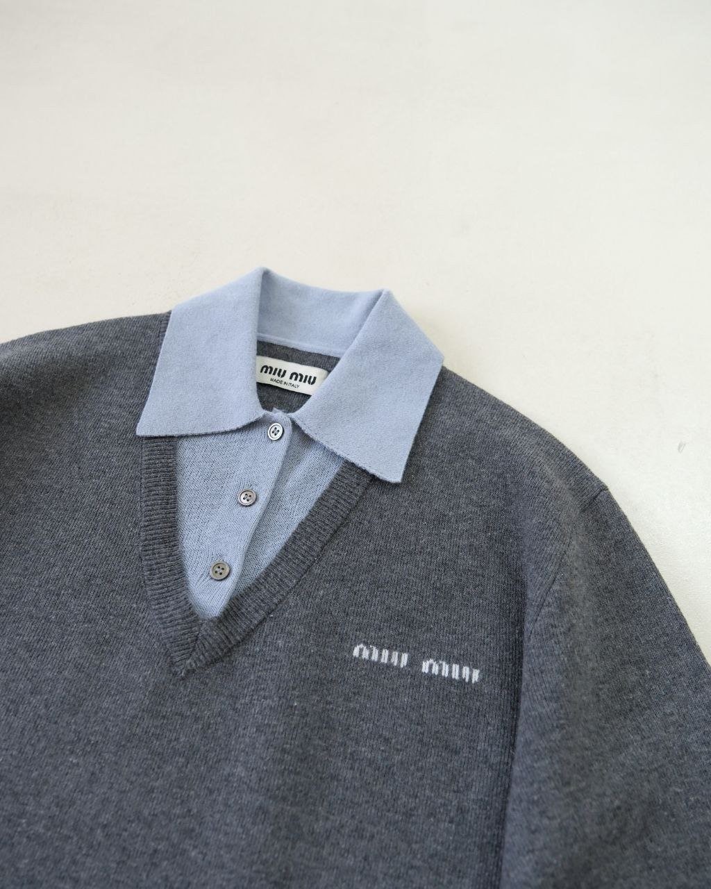 •Mi* Mi*(미***) FW 시즌의 울 혼방 모란디 톤 폴* 카라 배색 스타일의 레이어드 효과 롱슬리브 니트로, 남녀 공용으로 착용 가능한 제품입니다. 오리지널과 동일한 울 혼방 원사를 사용했으며, 세 가지 소재를 조합해 피부에 닿는 감이 부드러운 텐셀, 엄선된 울, 광택이 도는 실크를 더해 원단의 드레이프감과 고급스러움을 살렸습니다. 울 혼방 원사 구성은 울 35%, 면 45%, 나일론 20%로, 원단의 흐르는 느낌과 착용감을 높이기 위해 배합한 비율입니다.
