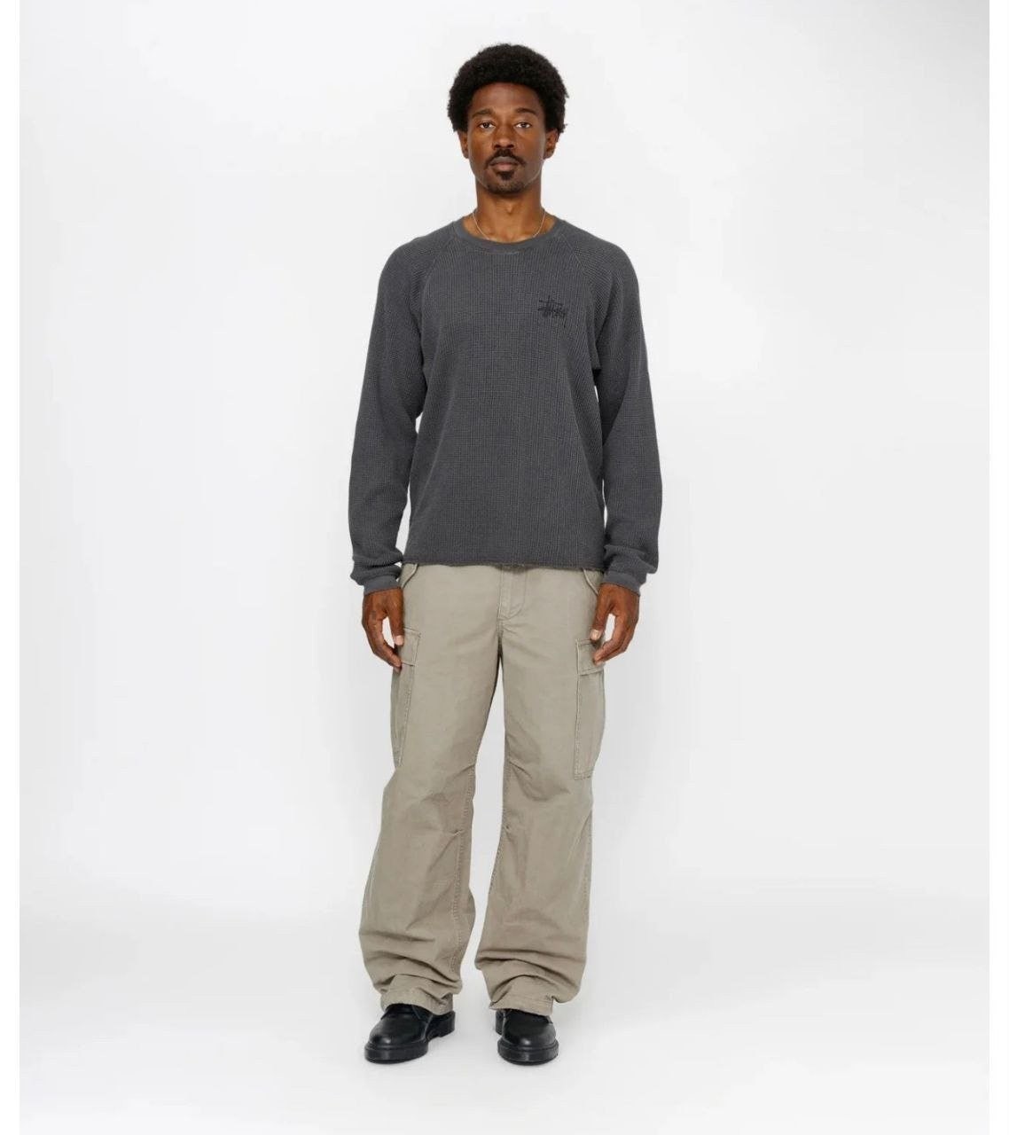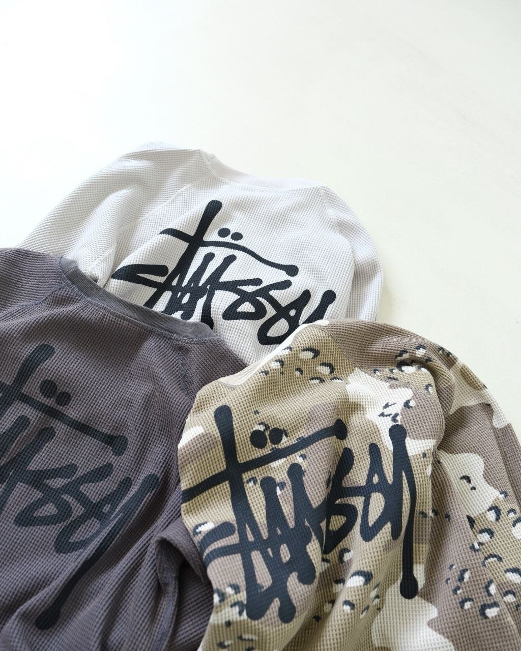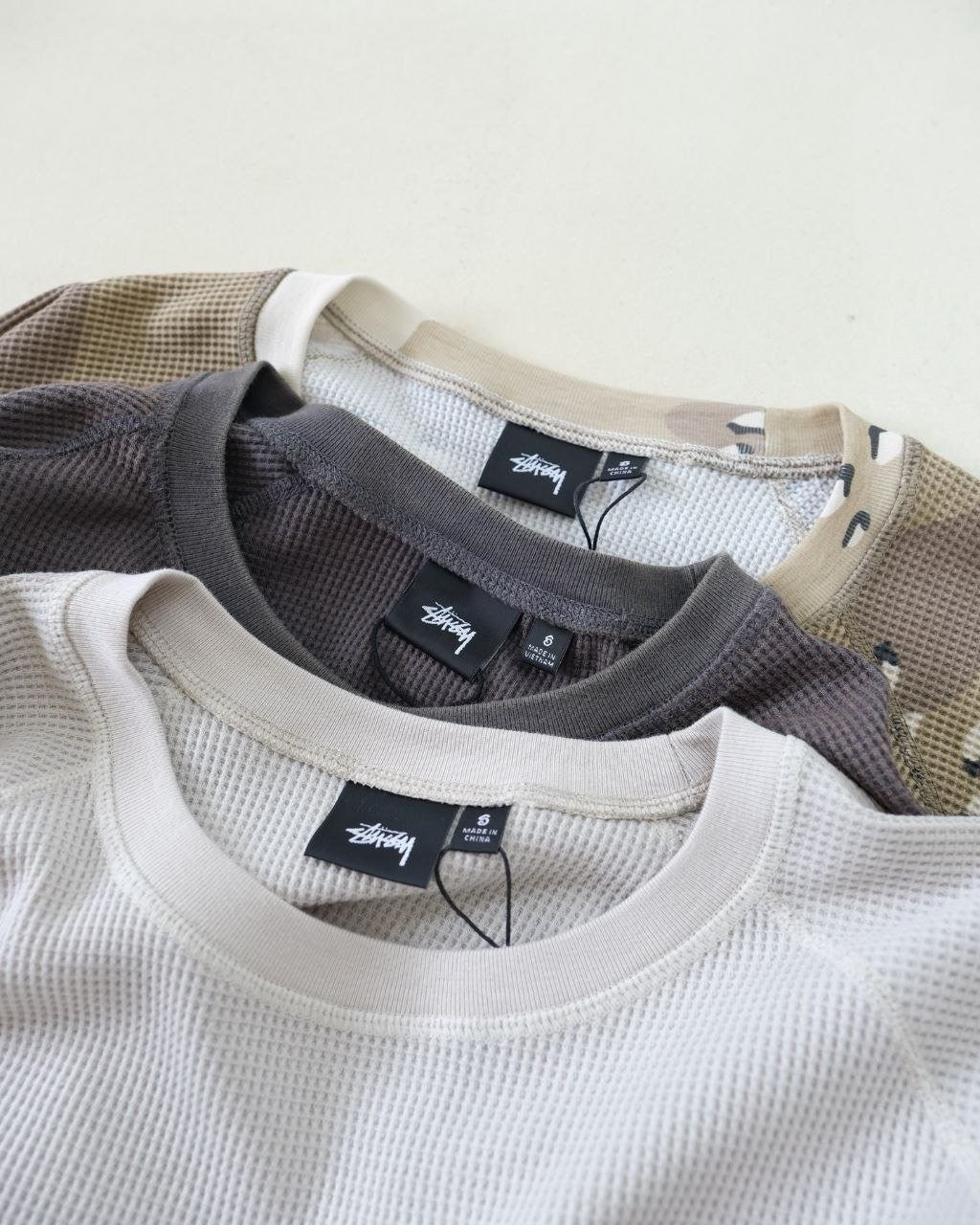 •Stus** 가을 컬렉션 로고 래글런 슬리브 와플 롱슬리브 티셔츠 (유니섹스) 오리지널을 분해 분석해 개발했으며, 작은 로고 패치·넥 라벨·워싱·행택을 1:1로 커스텀 재현했습니다. 와플 원단을 사용해 일정한 신축성과 도톰함이 있으며, 통기성과 드레이프가 좋아 피부에 부드럽고 포근하게 닿습니다. 전체 실루엣은 레귤러핏에 가깝게 약간 넉넉한 핏이며, 래글런 소매 설계로 체형 보정과 수용성이 좋아 다양한 체형에 잘 어울립니다. 로고 프린트는 정밀 공법으로 원단과 일체감 있게 표현되었고, 살짝 빈티지 워싱된 듯한 효과로 자연스럽고 레트로한 무드를 연출합니다.