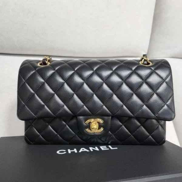 • 샤* 클래식 미듐 플랩백 램스킨 블랙 금장 A01112 풀박스 고급