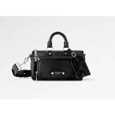 퍼렐 윌리엄스가 반짝이는 블랙 색상의 카프스킨 소재로 선보이는 키폴 카고 반둘리에 25. 퍼렐 윌리엄스 특유의 댄디한 미학을 담아낸 절제되고 우아한 시티백.
