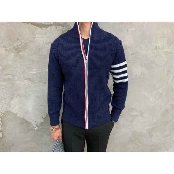 3단 배색 삼선포인트의 고급니트집업 입니다. 몸의 실루엣을 잘 잡아주어 탄탄해 보이는 효과가 있으며, 지퍼에 3단 배색 패턴과 팔에 사선이 더해져 세련된 느낌을 주도록 제작하였습니다. 색상 스타일에 상관없이 어떠한 코디에도 레이어링 가능하며 유행타지 않는 디자인으로 간결하고 고급스럽게 제작되어 언제나 손이 자주가는 고급 니트집업입니다.