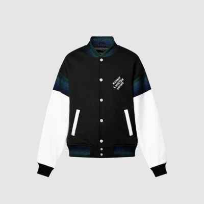 부드럽고 둥근 실루엣으로 재해석해 봄에 착용하기 좋은 상징적인 바시티 재킷. 면 저지 소재. 여유 있는 어깨 라인. 소매 윗부분과 칼라, 허리 라인을 장식한 무지갯빛의 세련된 리브드 디테일. 가슴 부분에 화이트 색상으로 수놓은 Marque L.Vuitton Déposée 자수. 댄디한 감성을 선사하는 진주 효과를 더한 버튼으로 제작 되었습니다.