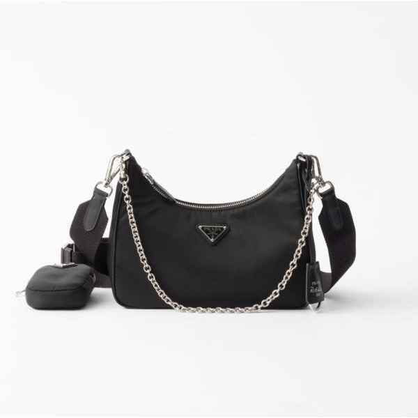 아이코닉한 미니 호보 백에서 영감을 얻은 프라다 리에디션 숄더 백으로, 사피아노 가죽 트리밍으로 장식했으며 숄더 스트랩에 부착할 수 있는 탈부착형 파우치가 함께 제공되어 활용도가 높습니다.