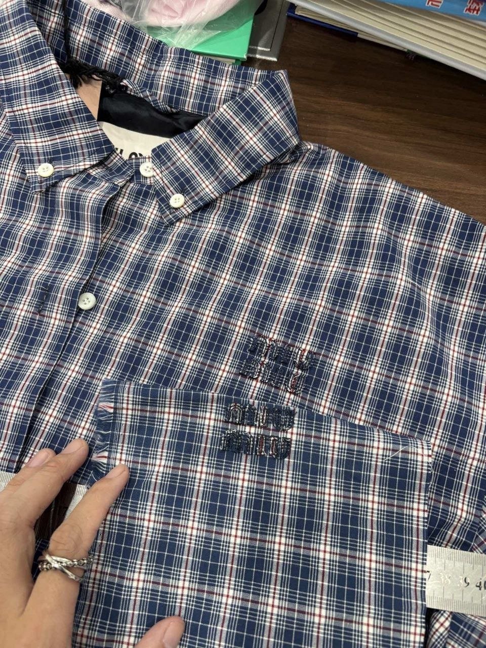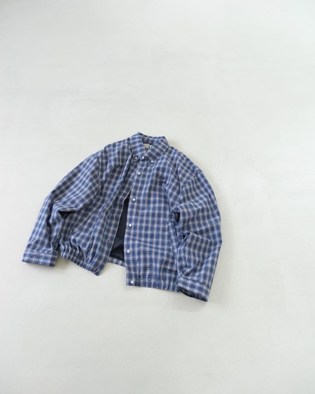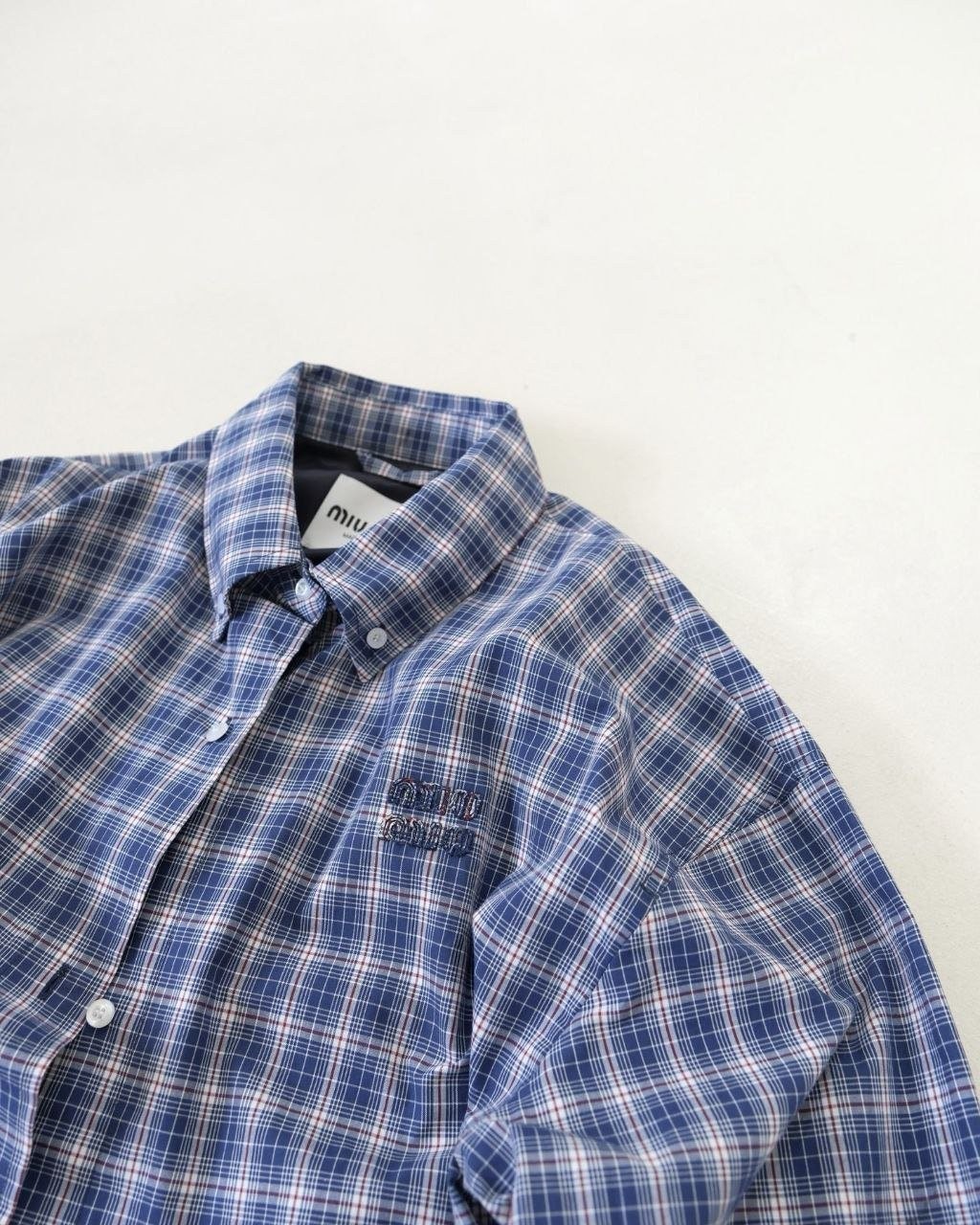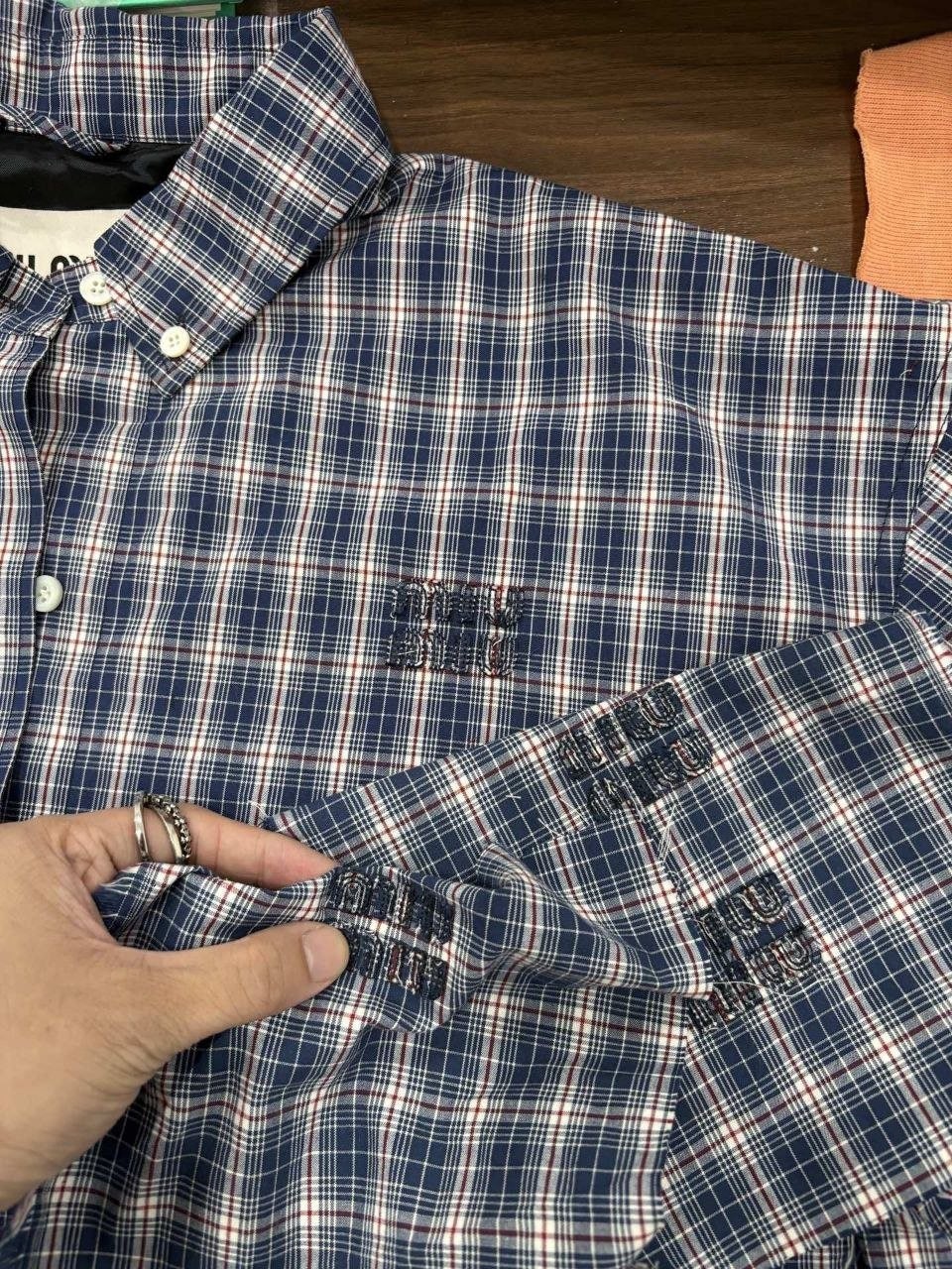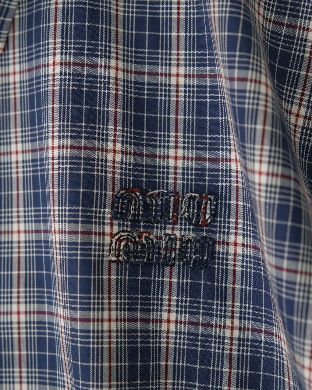 •오리지널을 기반으로 개발된 제품으로, 맞춤 제작한 블루×화이트 올코튼 체크 거즈 직물을 사용했습니다. 직조 결이 선명하고 색감이 또렷하며, 세 가지 컬러가 어우러진 체크가 빈티지와 모던 무드를 동시에 담아냅니다. 가슴에는 섬세한 miu m** 레터링 디테일이 더해져 포인트가 됩니다. 드롭 숄더 디자인으로 어깨 라인을 자연스럽게 보정해 주어 실루엣이 여유롭고 편안합니다.