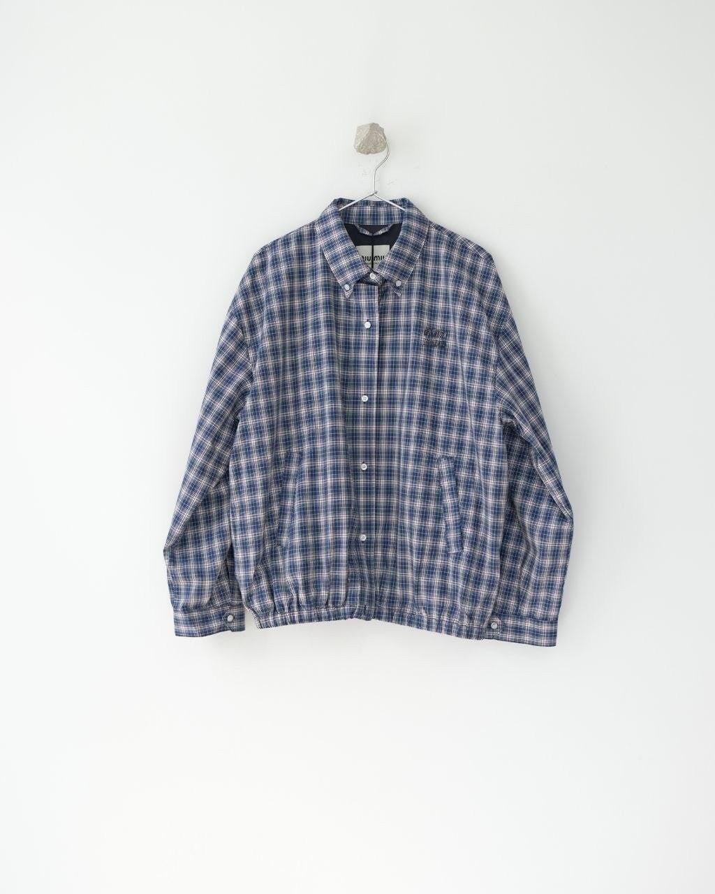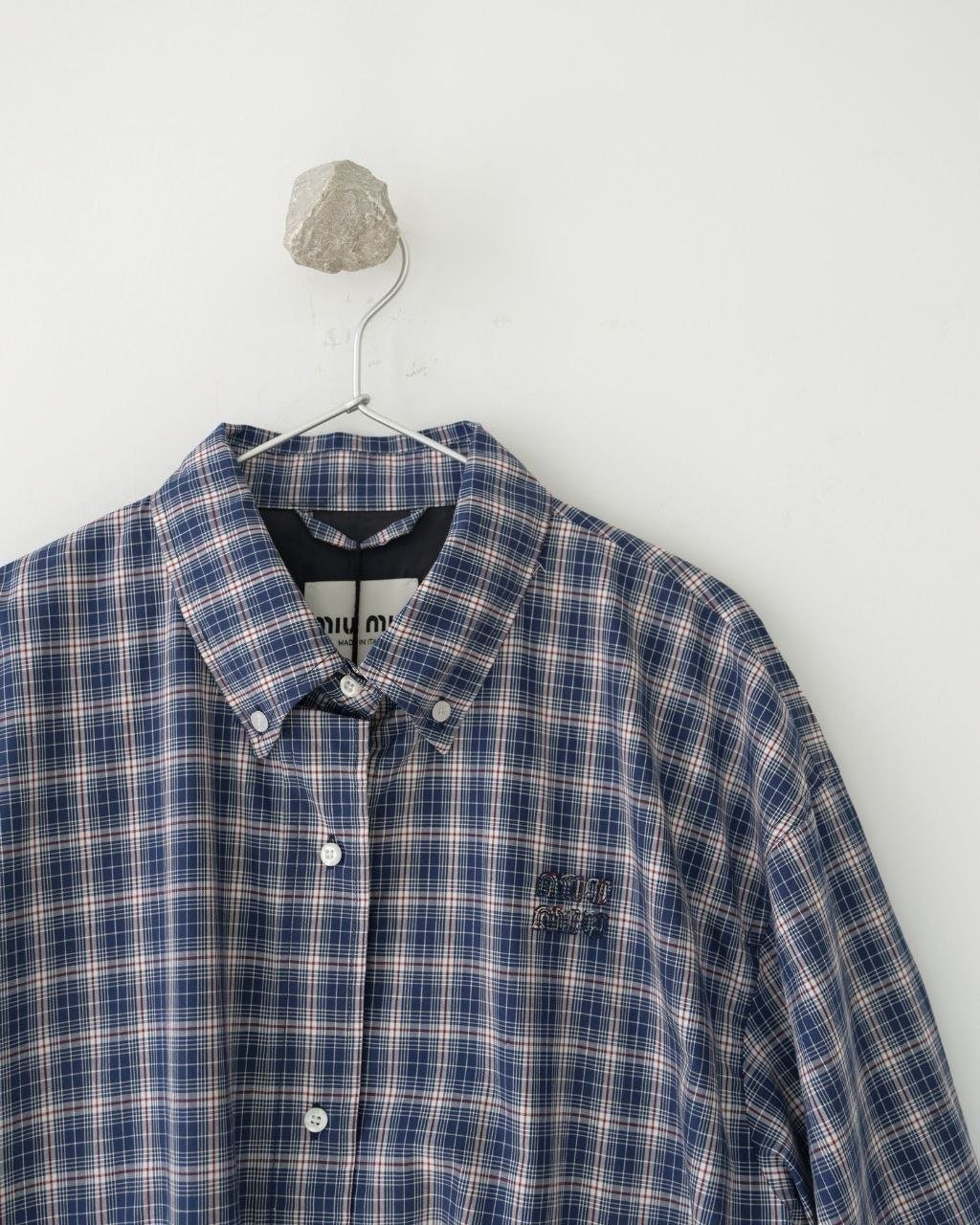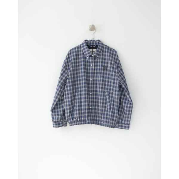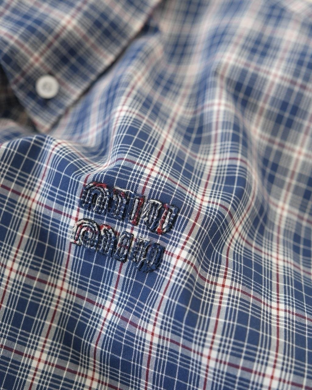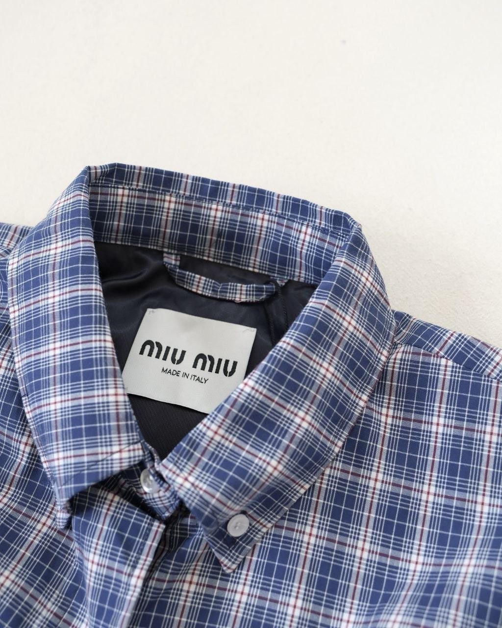 •오리지널을 기반으로 개발된 제품으로, 맞춤 제작한 블루×화이트 올코튼 체크 거즈 직물을 사용했습니다. 직조 결이 선명하고 색감이 또렷하며, 세 가지 컬러가 어우러진 체크가 빈티지와 모던 무드를 동시에 담아냅니다. 가슴에는 섬세한 miu m** 레터링 디테일이 더해져 포인트가 됩니다. 드롭 숄더 디자인으로 어깨 라인을 자연스럽게 보정해 주어 실루엣이 여유롭고 편안합니다.