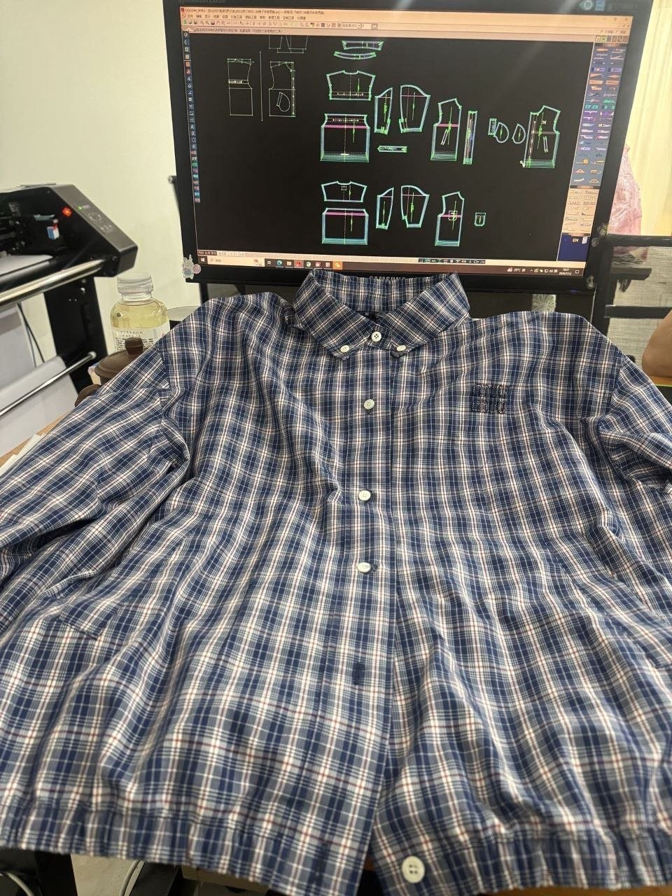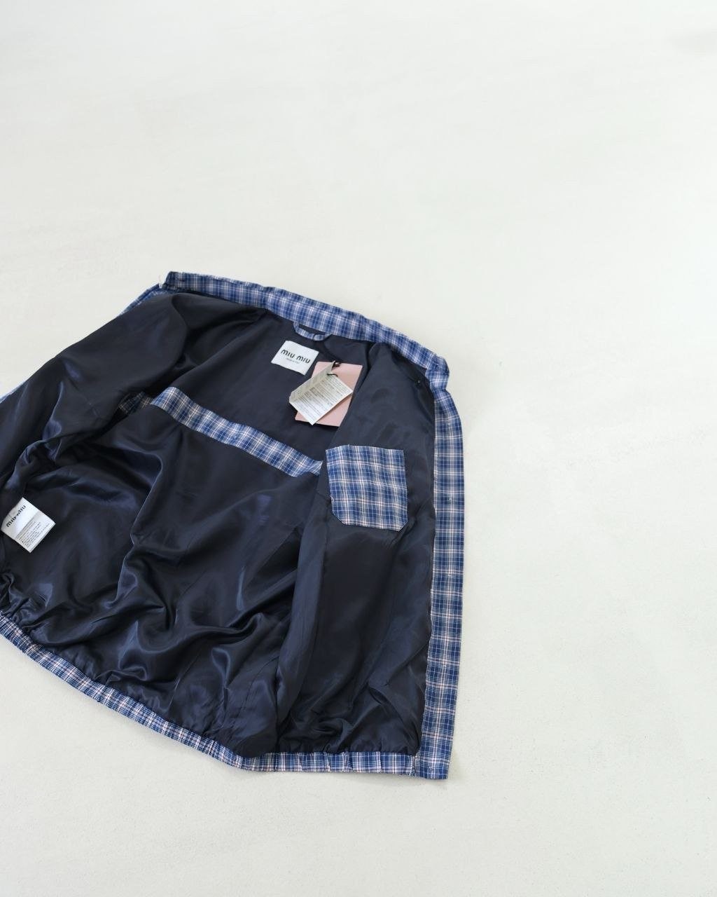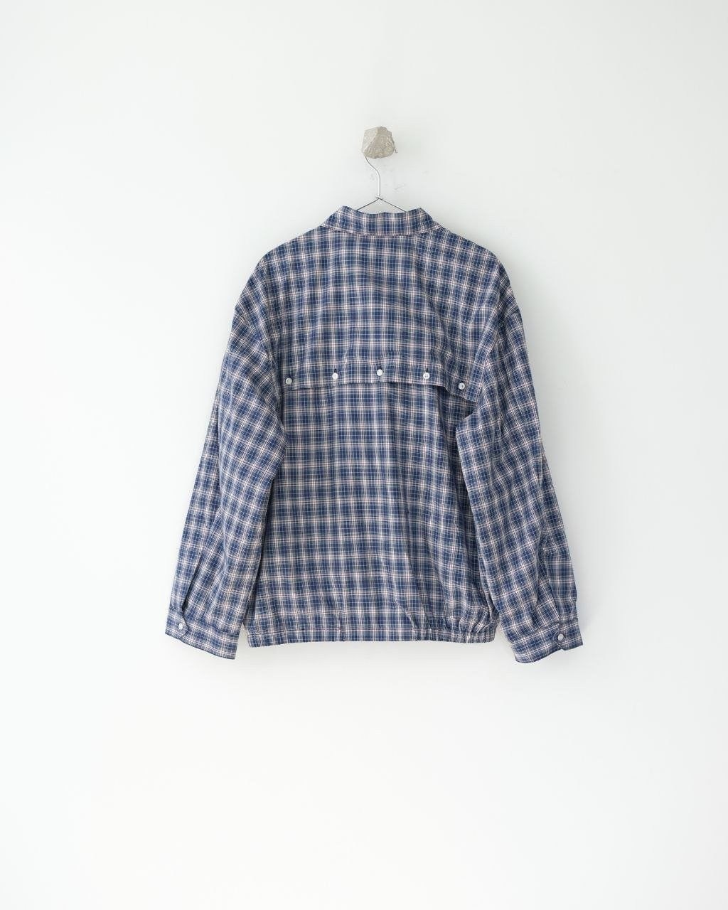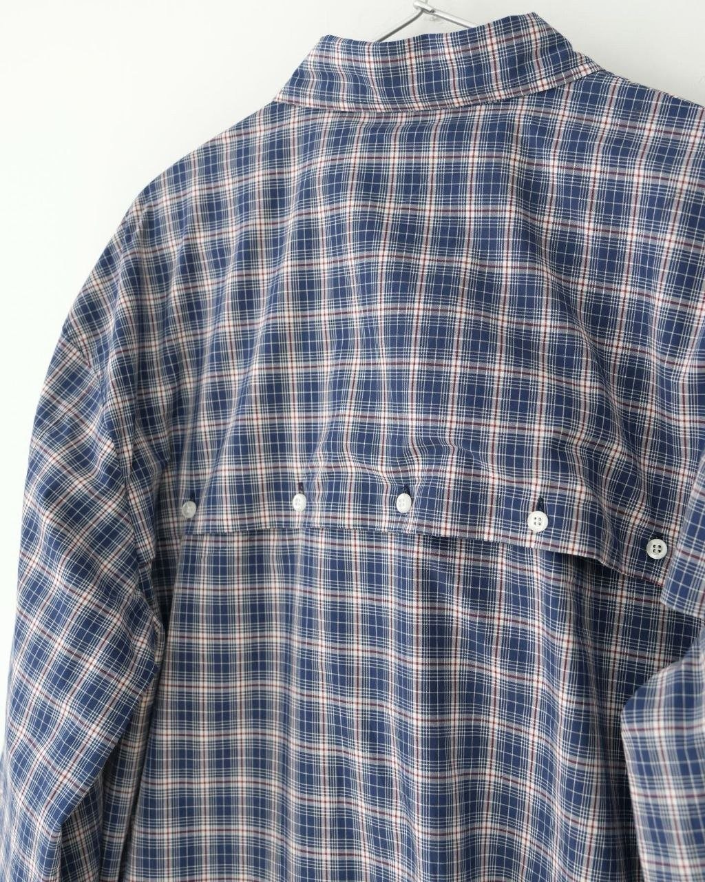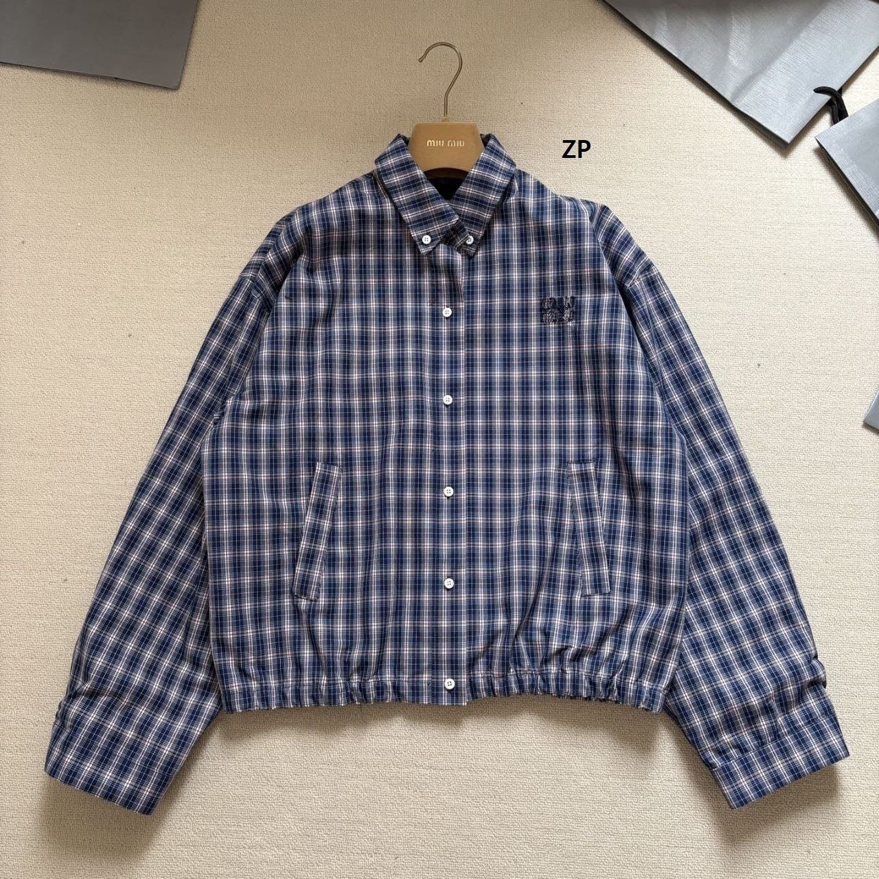 •오리지널을 기반으로 개발된 제품으로, 맞춤 제작한 블루×화이트 올코튼 체크 거즈 직물을 사용했습니다. 직조 결이 선명하고 색감이 또렷하며, 세 가지 컬러가 어우러진 체크가 빈티지와 모던 무드를 동시에 담아냅니다. 가슴에는 섬세한 miu m** 레터링 디테일이 더해져 포인트가 됩니다. 드롭 숄더 디자인으로 어깨 라인을 자연스럽게 보정해 주어 실루엣이 여유롭고 편안합니다.