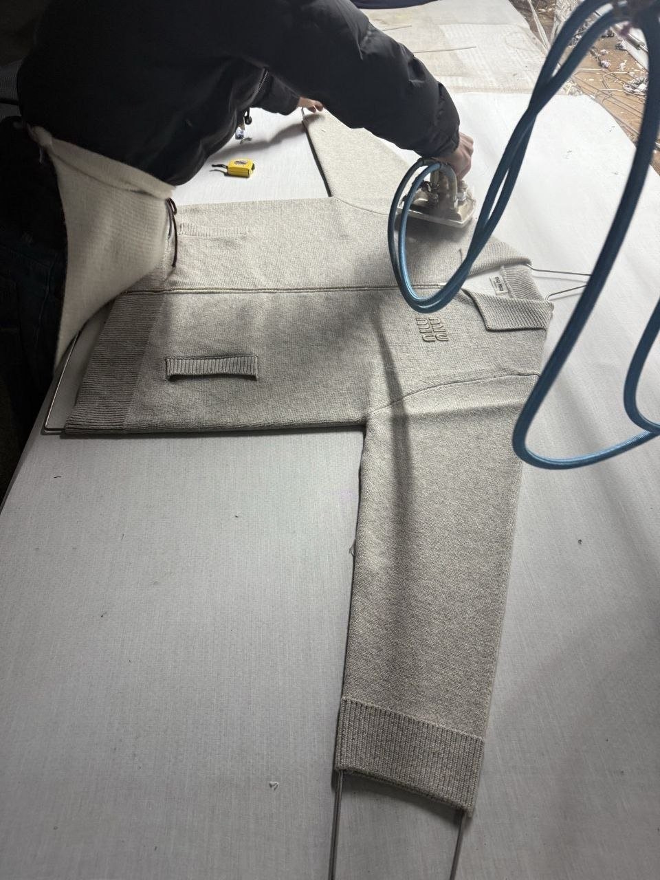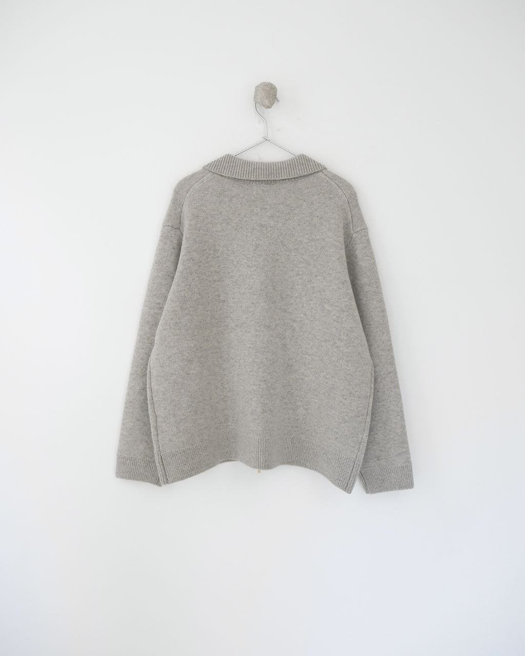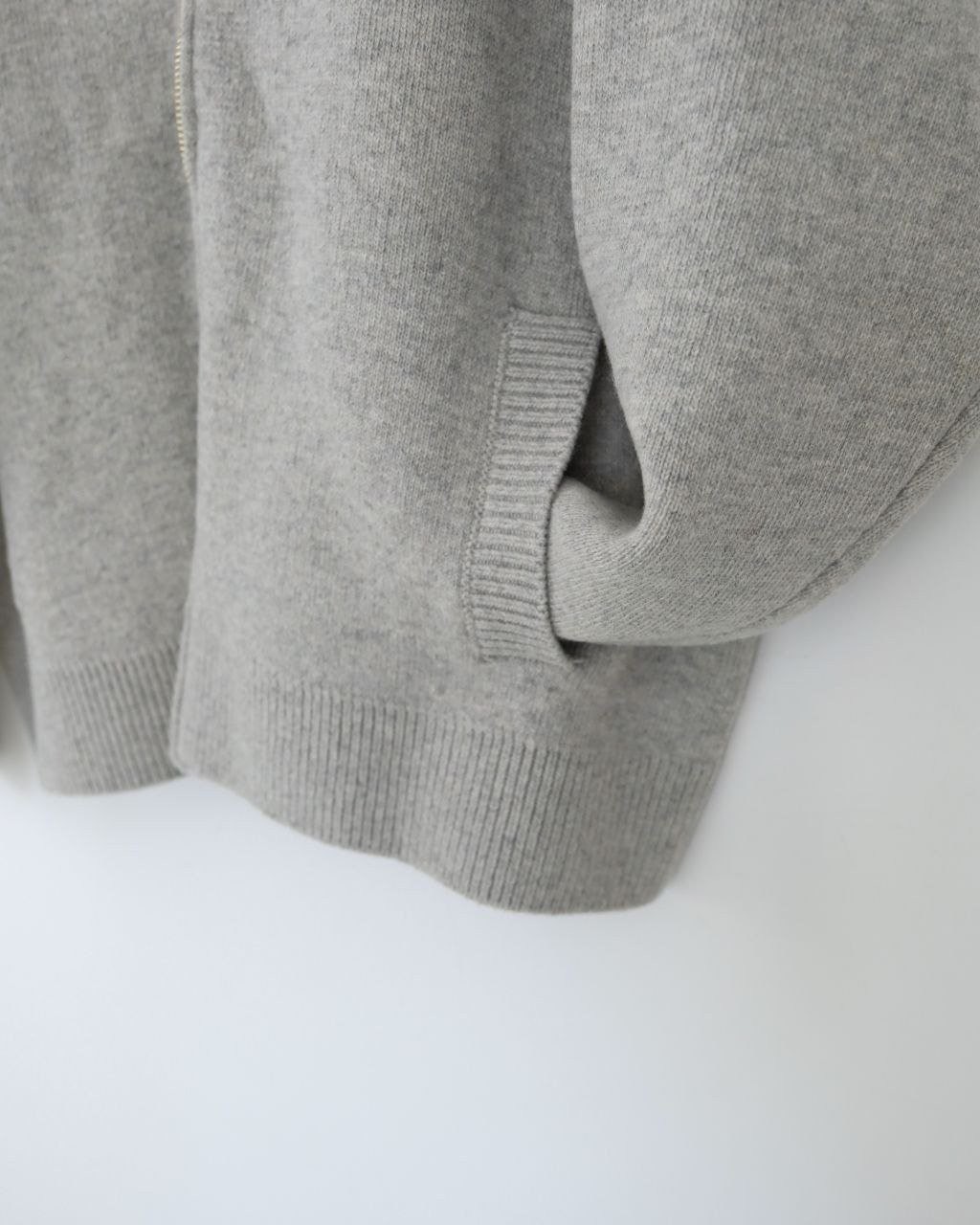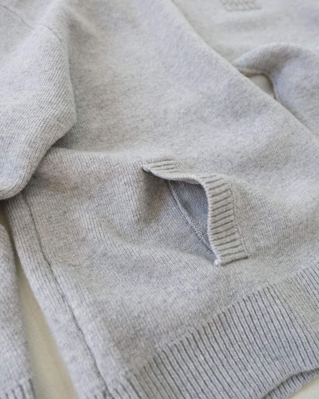 •편직·제작 공정: 독일 Stoll(스톨) 정식 5바늘 편직기로 제작하고 이중 편직 기법을 적용해 가운데 실을 하나 더 넣어 전체적인 탄탄함과 형태 유지력을 강화했습니다. 기계 생산 속도가 매우 느려 한 벌당 편직 시간이 약 130분에 달하며, 하루 22시간 가동으로도 약 10벌만 생산 가능한 정성 공정입니다. 42사이즈 기준 단품 중량은 약 1,000g로 묵직하게 완성됩니다.