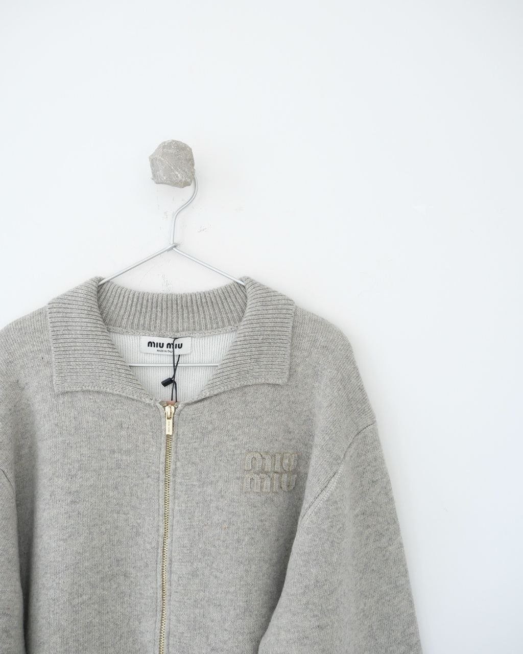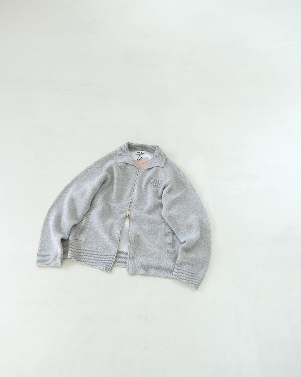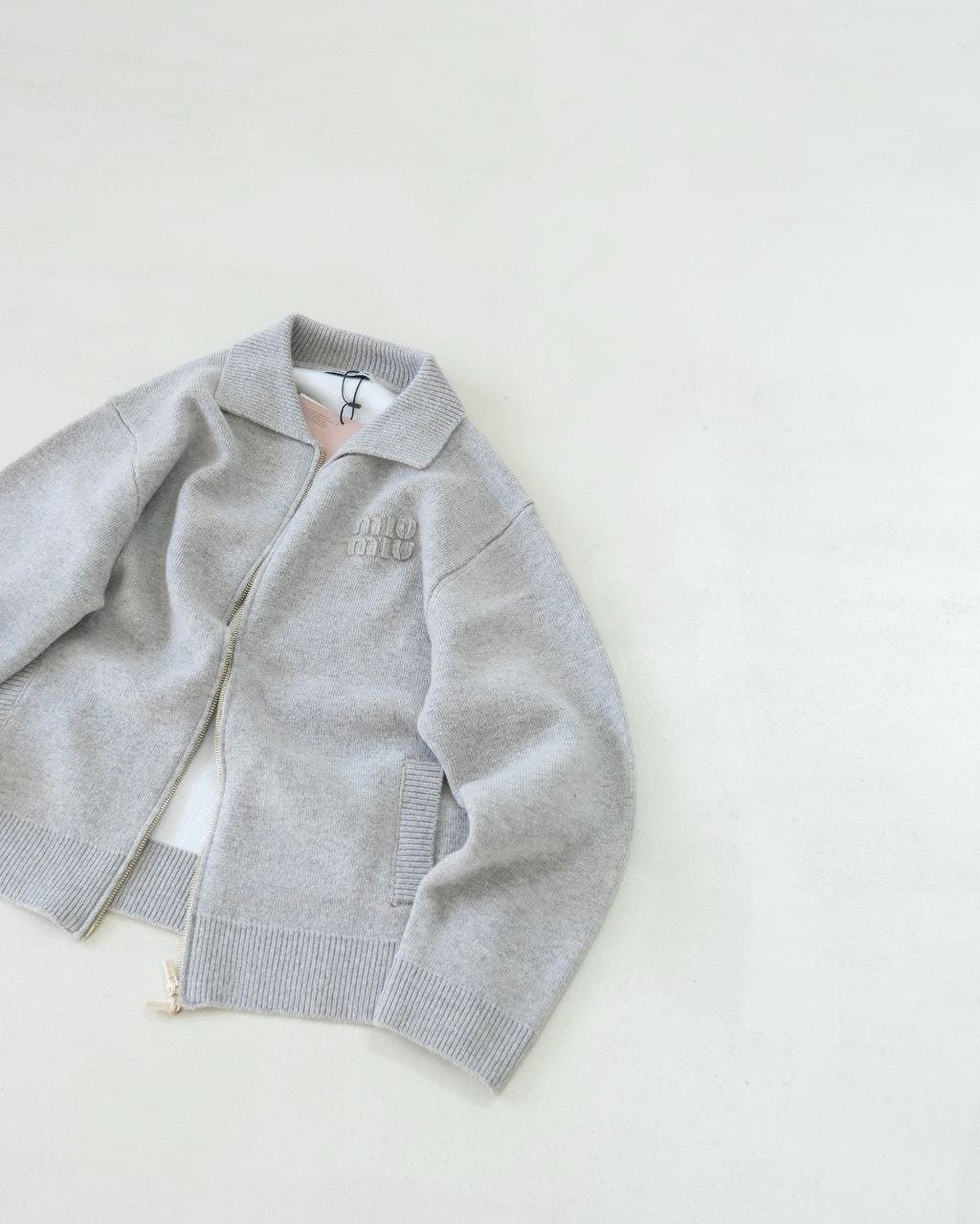 •Mi* Mi*(미***) FW 따뜻한 톤의 로고 패치 자수 장식 울 카라 지퍼 롱슬리브 가디건(재킷)입니다.