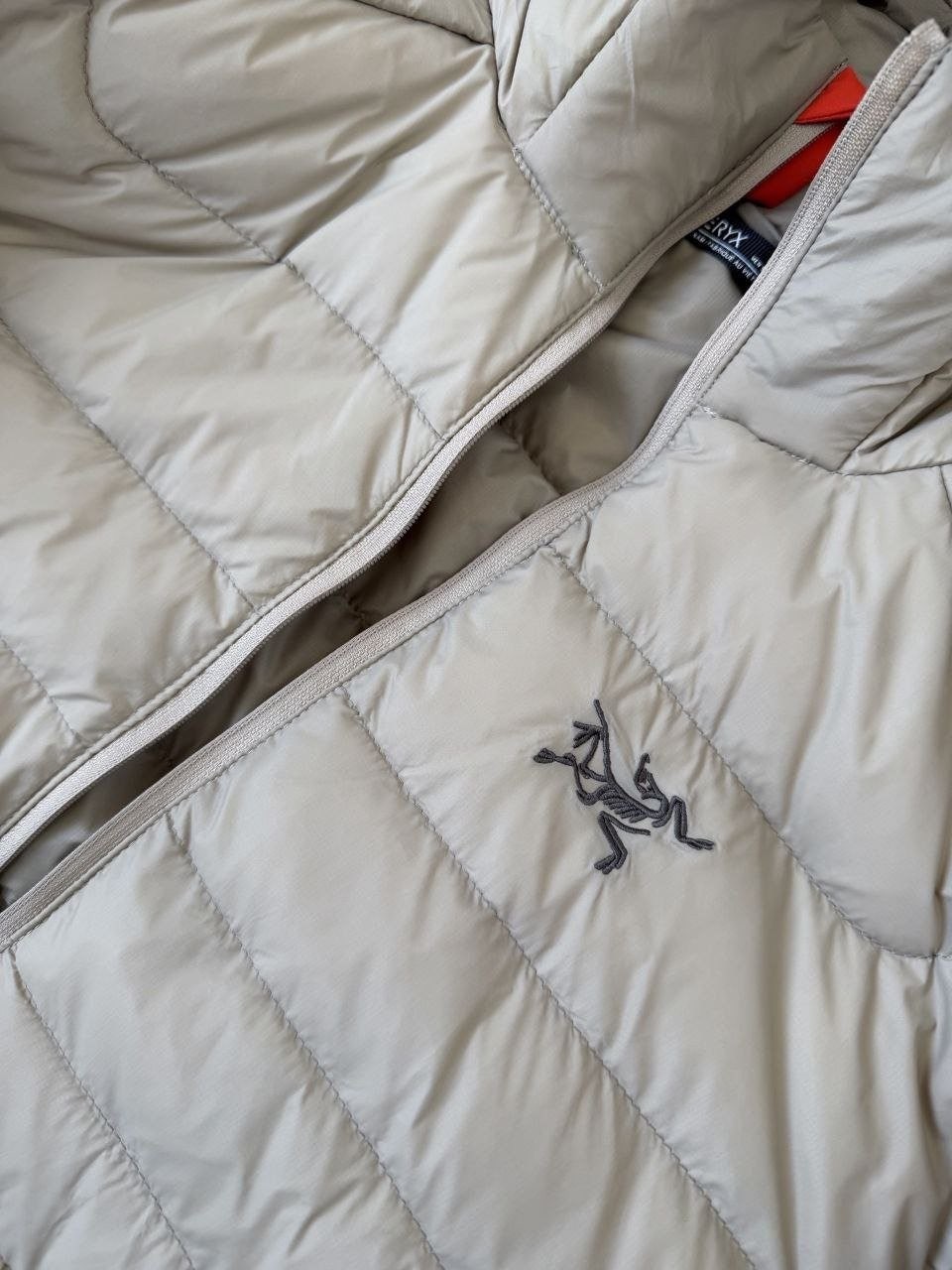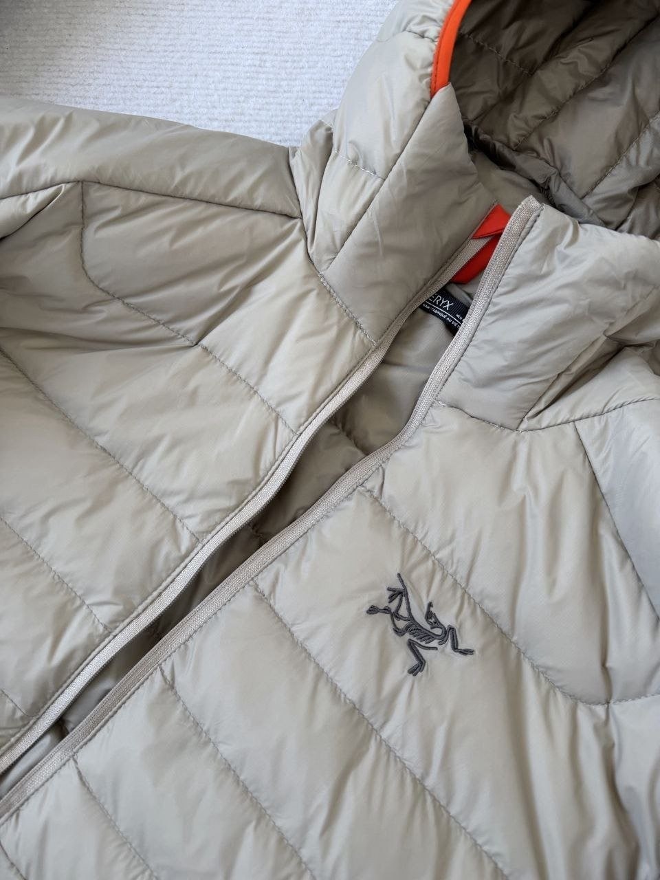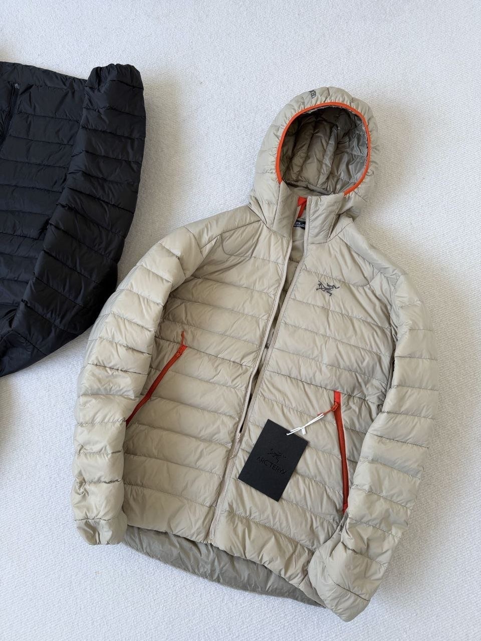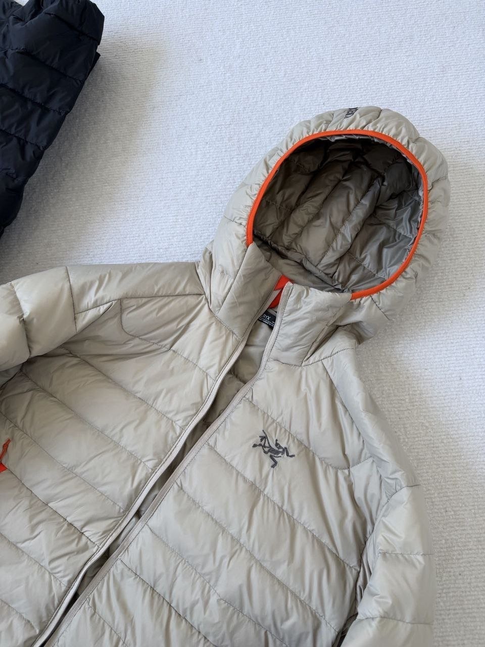 •Arcter**(아크테릭*) Cerium 850 필파워 구스다운 경량 방풍 보온 후드 재킷 입니다. 옷 전체에 초경량 원단과 충전재를 사용해 매우 작게 압축할 수 있으며, 옷 안쪽 가슴 포켓에 내장된 수납 파우치에 넣어 보관할 수 있습니다. 수납 시 크기는 중간 맥주캔(중간 크기 캔) 정도로 작아 휴대가 편리합니다. 초경량으로 활동 시 제약이 거의 없고(제품별·사이즈별 충전량은 약 200–250g 내외로 상이함) 얇지만 보온성과 방풍성은 뛰어납니다. 진정한 다운의 보온성을 잘 살린 제품입니다.