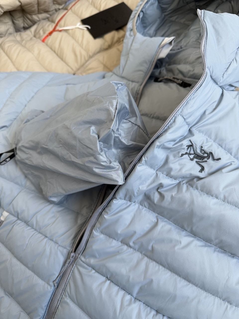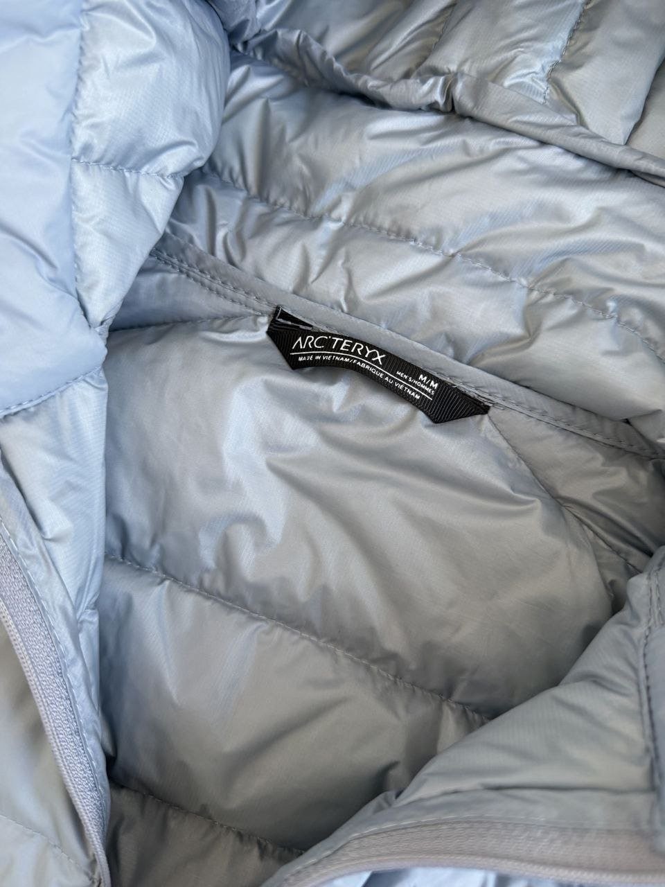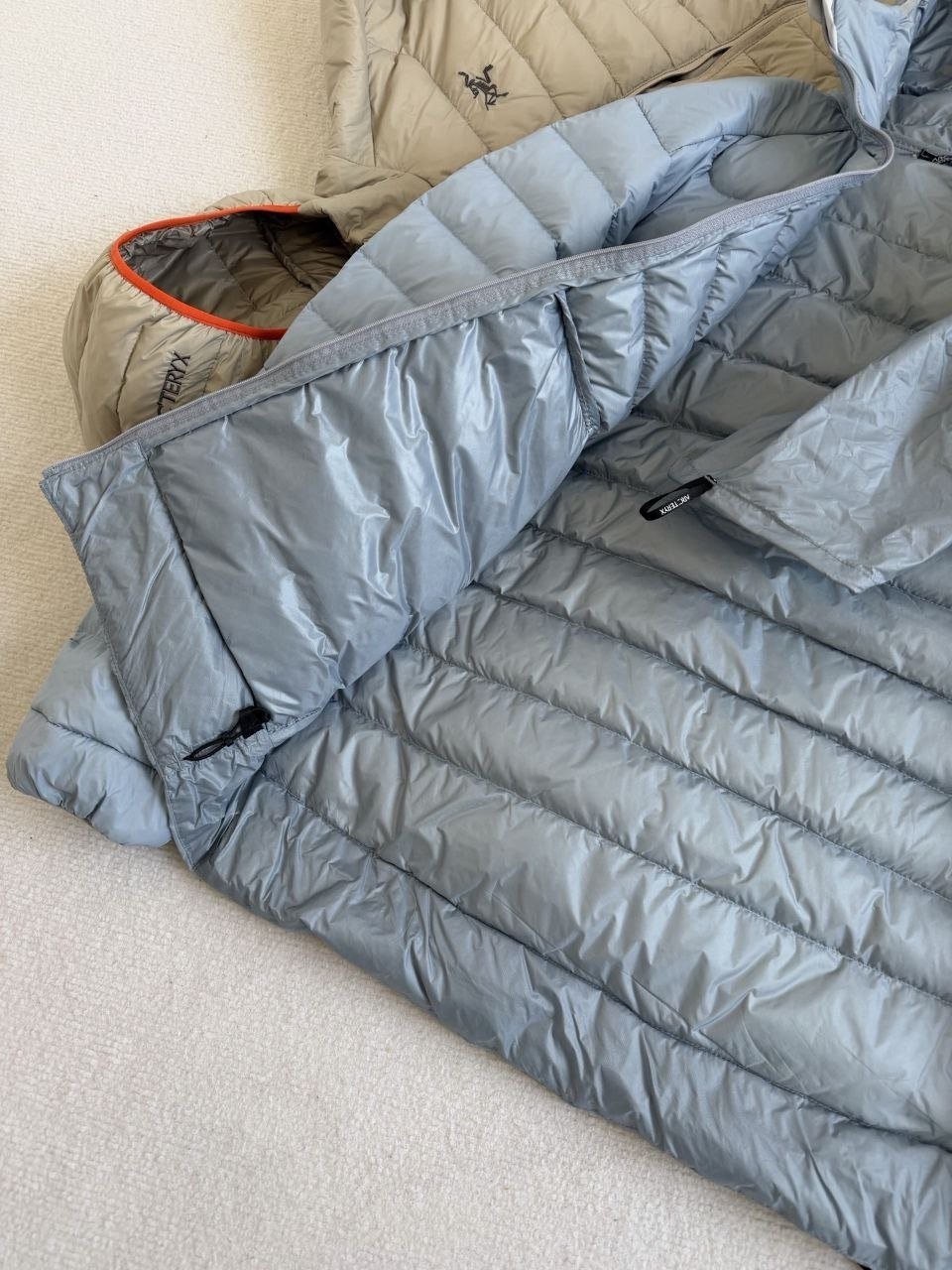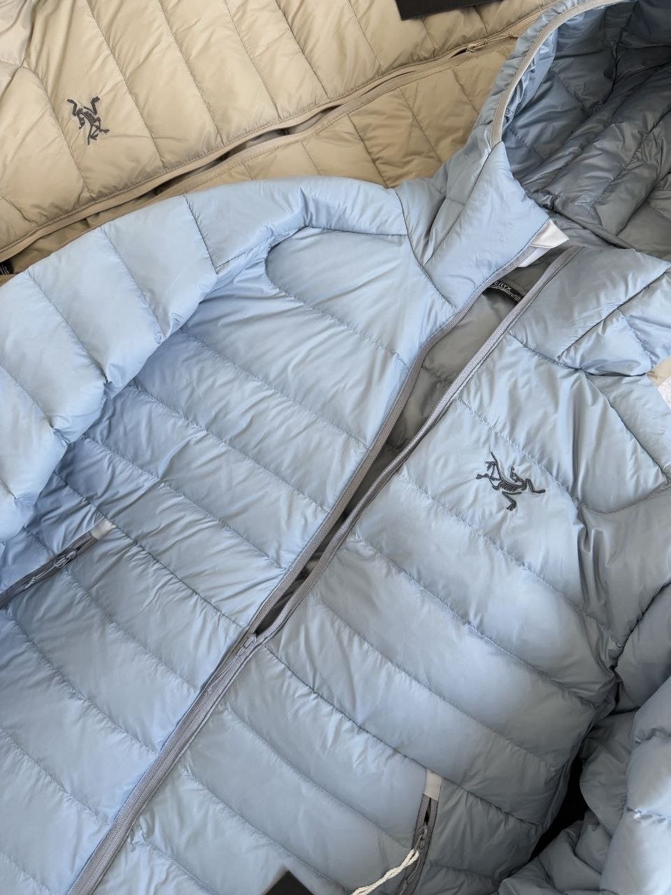 •Arcter**(아크테릭*) Cerium 850 필파워 구스다운 경량 방풍 보온 후드 재킷 입니다. 옷 전체에 초경량 원단과 충전재를 사용해 매우 작게 압축할 수 있으며, 옷 안쪽 가슴 포켓에 내장된 수납 파우치에 넣어 보관할 수 있습니다. 수납 시 크기는 중간 맥주캔(중간 크기 캔) 정도로 작아 휴대가 편리합니다. 초경량으로 활동 시 제약이 거의 없고(제품별·사이즈별 충전량은 약 200–250g 내외로 상이함) 얇지만 보온성과 방풍성은 뛰어납니다. 진정한 다운의 보온성을 잘 살린 제품입니다.
