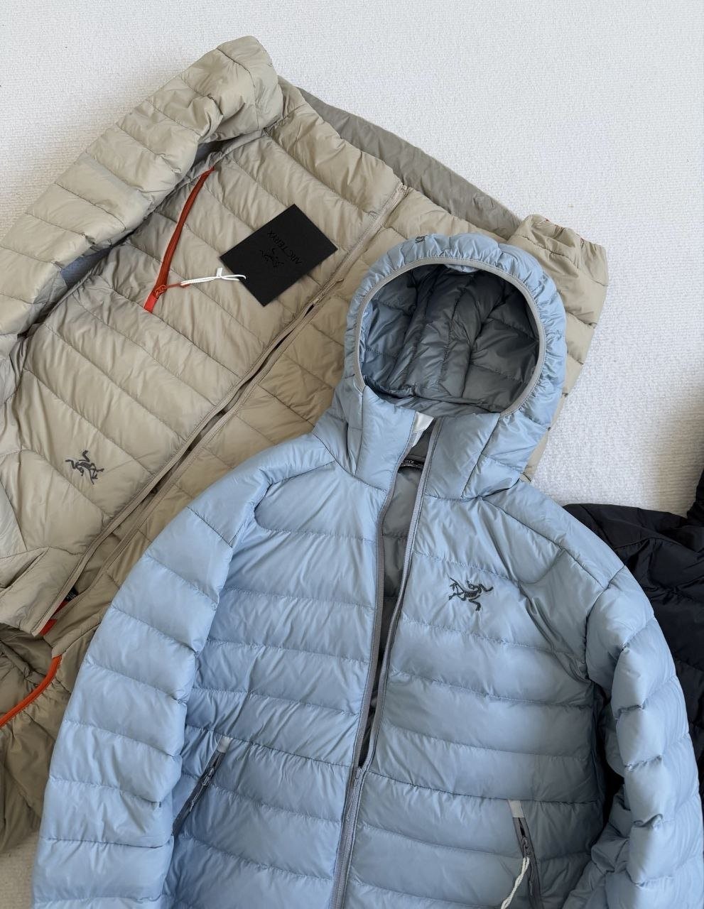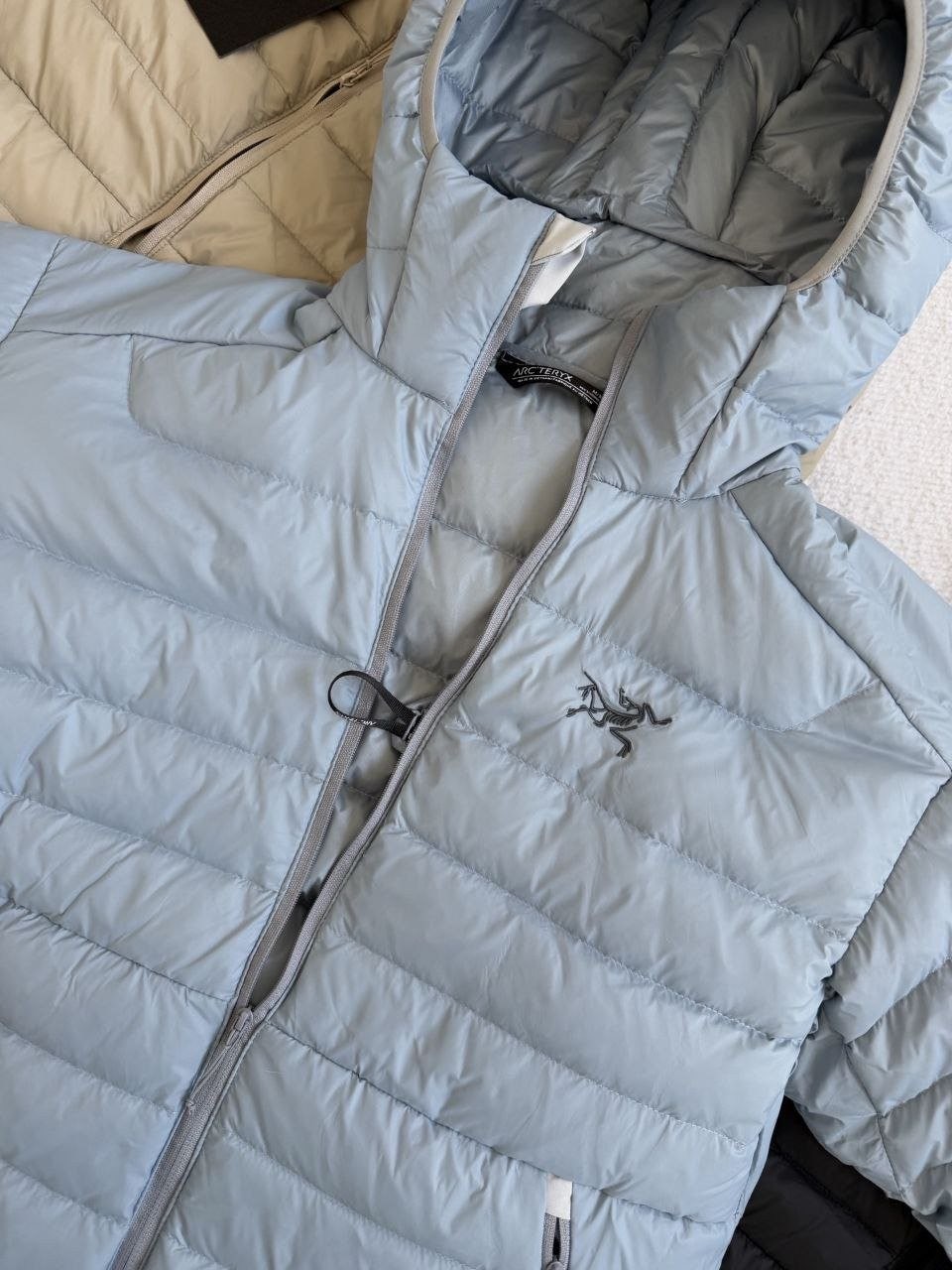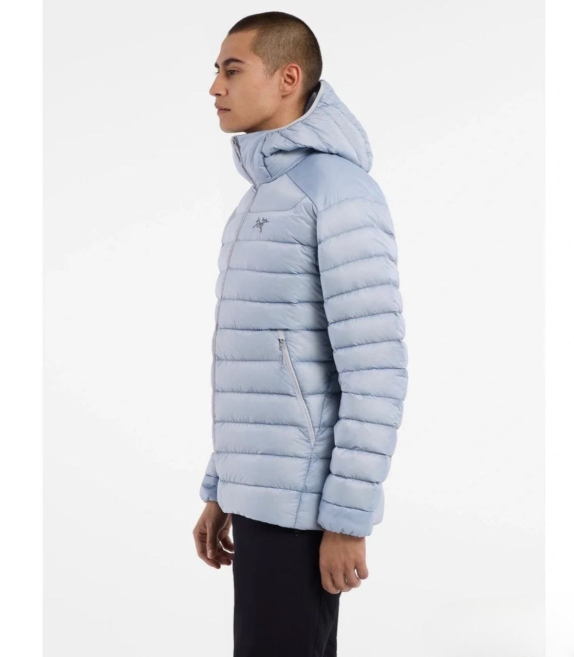 •Arcter**(아크테릭*) Cerium 850 필파워 구스다운 경량 방풍 보온 후드 재킷 입니다. 옷 전체에 초경량 원단과 충전재를 사용해 매우 작게 압축할 수 있으며, 옷 안쪽 가슴 포켓에 내장된 수납 파우치에 넣어 보관할 수 있습니다. 수납 시 크기는 중간 맥주캔(중간 크기 캔) 정도로 작아 휴대가 편리합니다. 초경량으로 활동 시 제약이 거의 없고(제품별·사이즈별 충전량은 약 200–250g 내외로 상이함) 얇지만 보온성과 방풍성은 뛰어납니다. 진정한 다운의 보온성을 잘 살린 제품입니다.