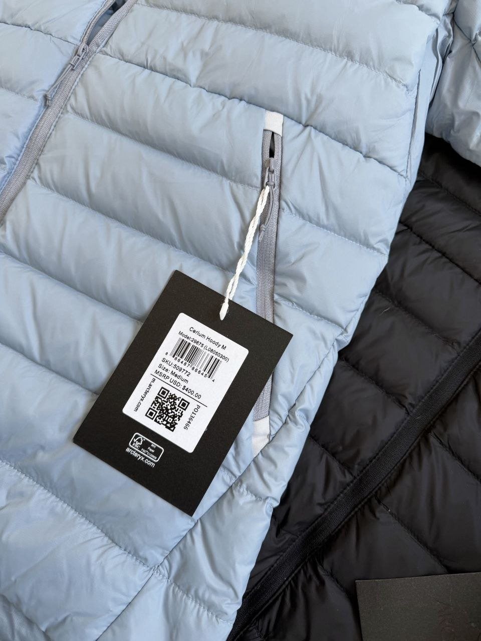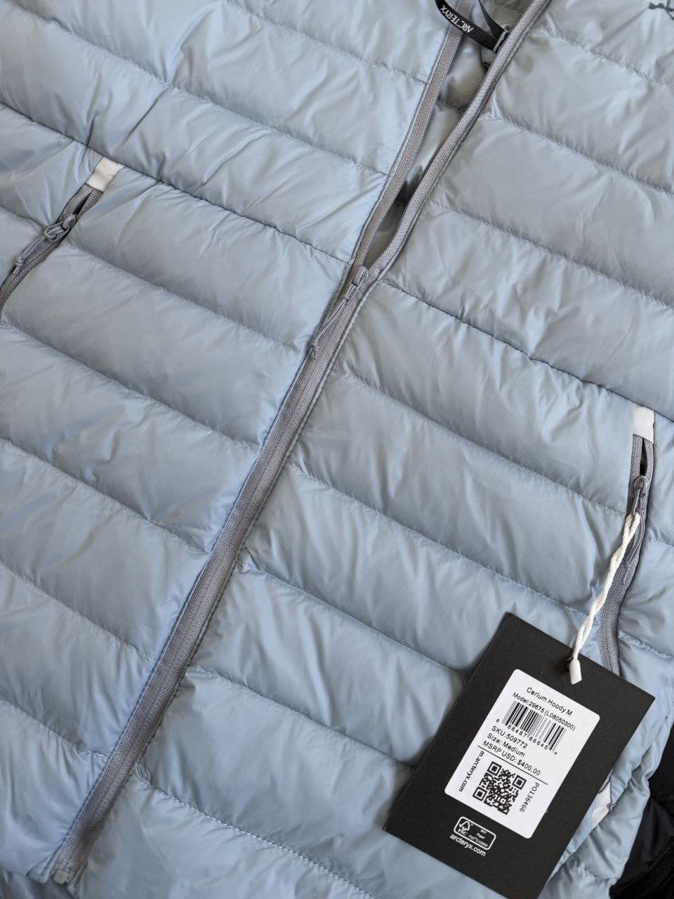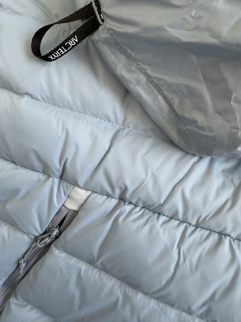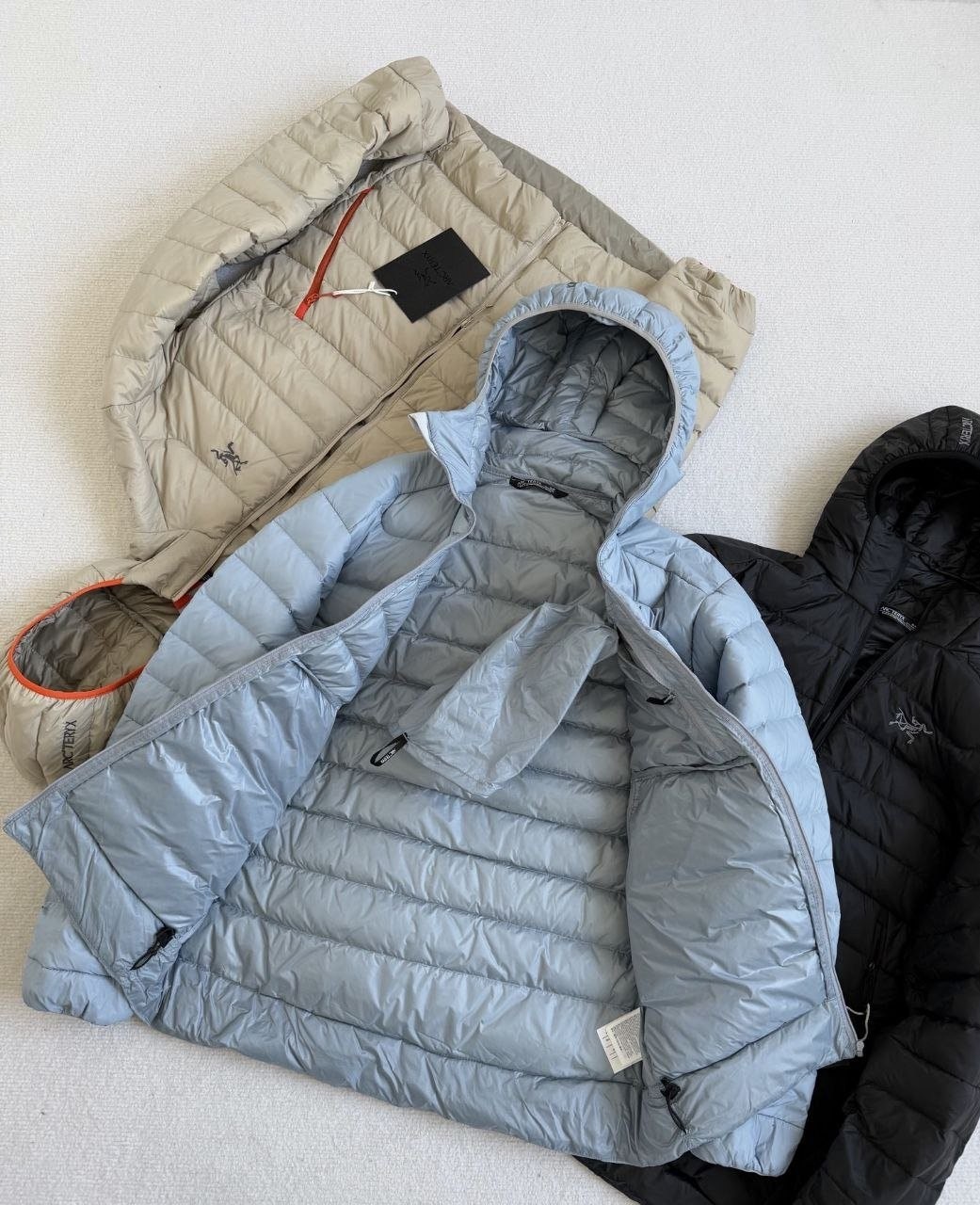•Arcter**(아크테릭*) Cerium 850 필파워 구스다운 경량 방풍 보온 후드 재킷 입니다. 옷 전체에 초경량 원단과 충전재를 사용해 매우 작게 압축할 수 있으며, 옷 안쪽 가슴 포켓에 내장된 수납 파우치에 넣어 보관할 수 있습니다. 수납 시 크기는 중간 맥주캔(중간 크기 캔) 정도로 작아 휴대가 편리합니다. 초경량으로 활동 시 제약이 거의 없고(제품별·사이즈별 충전량은 약 200–250g 내외로 상이함) 얇지만 보온성과 방풍성은 뛰어납니다. 진정한 다운의 보온성을 잘 살린 제품입니다.