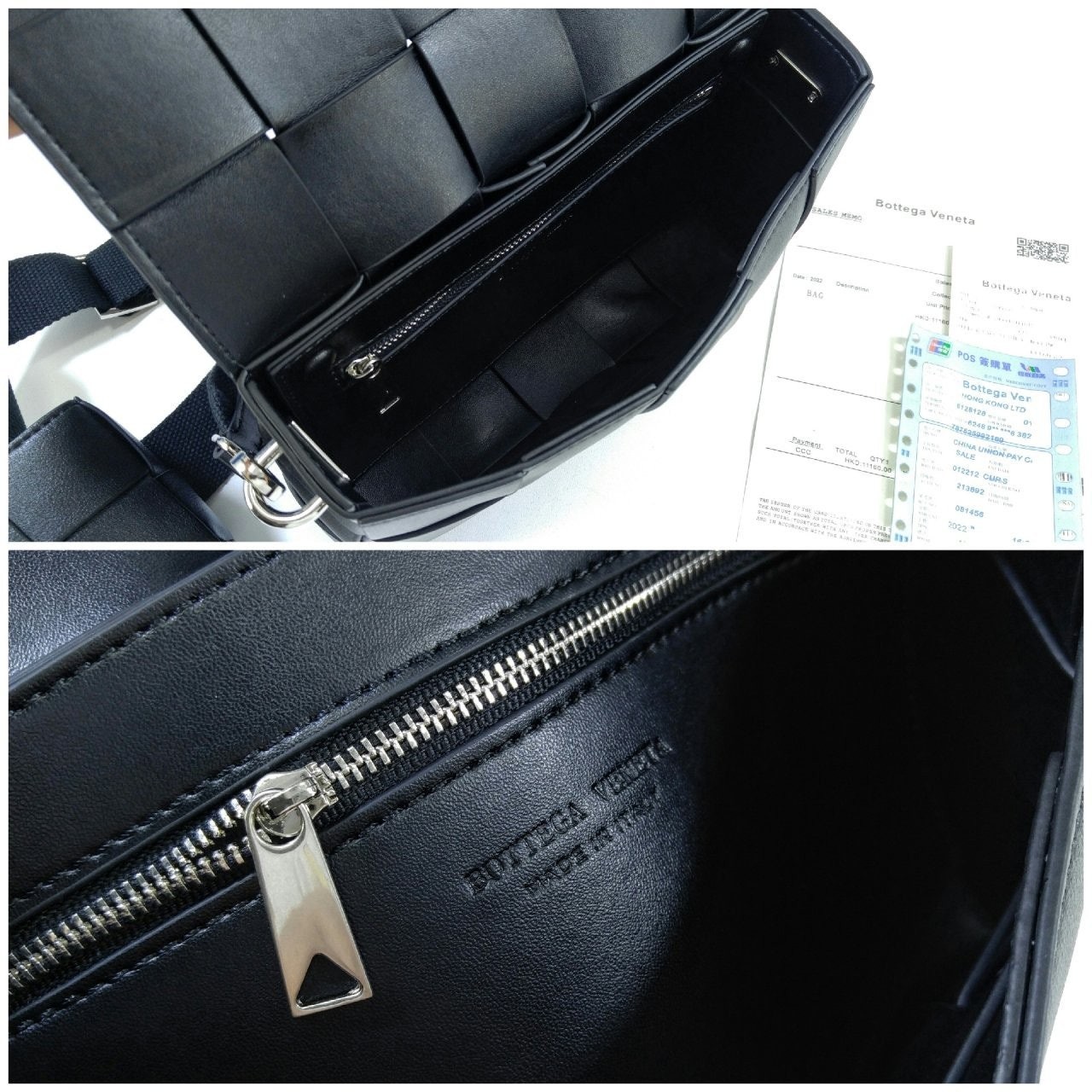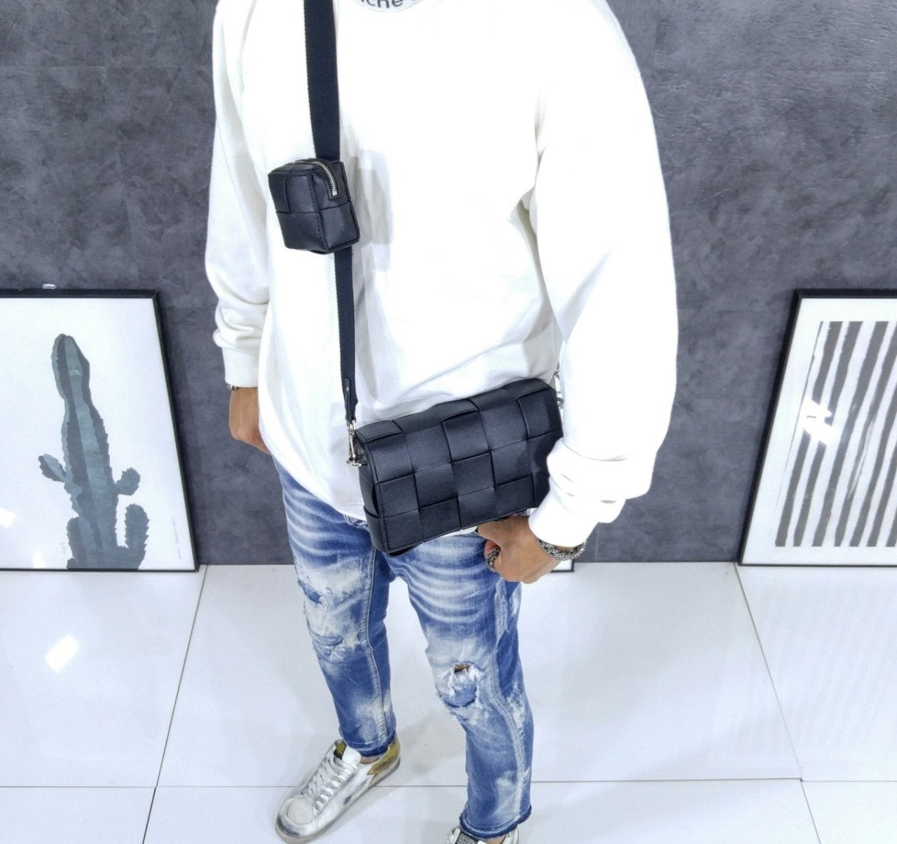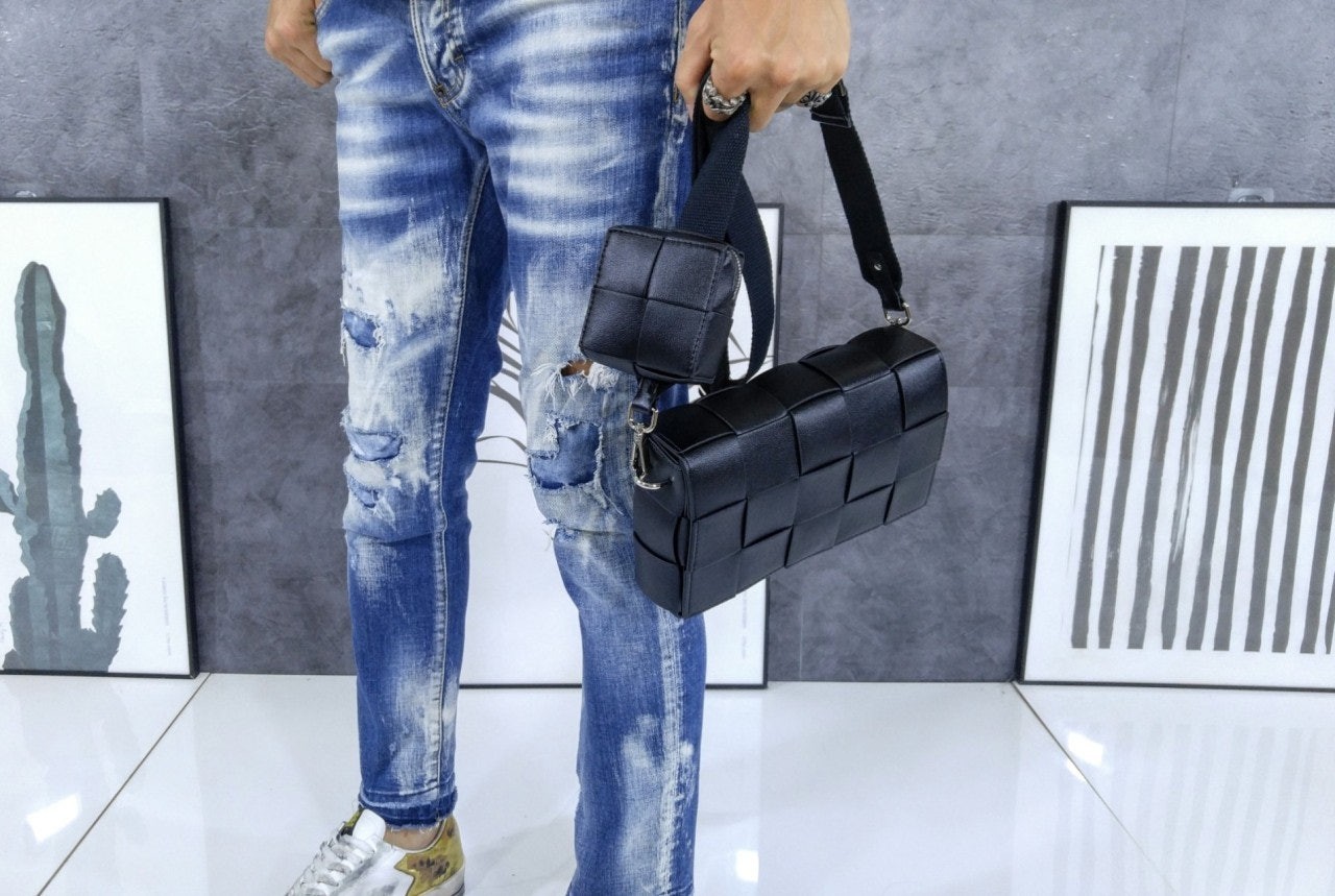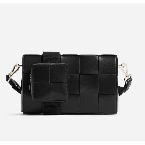가죽 소재를 인트레치오 위빙으로 완성한 장인 정신이 돋보이는 크로스바디 백으로 슬라이드 온 지퍼 동전 파우치와 길이 조절 가능한 캔버스 스트랩이 있음