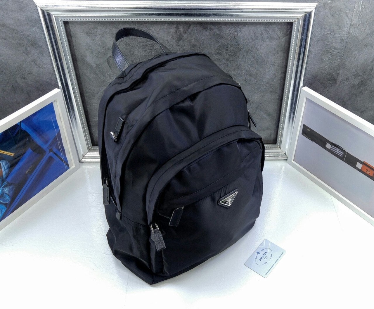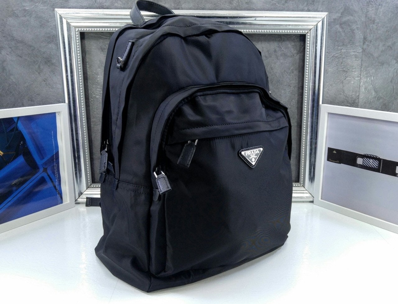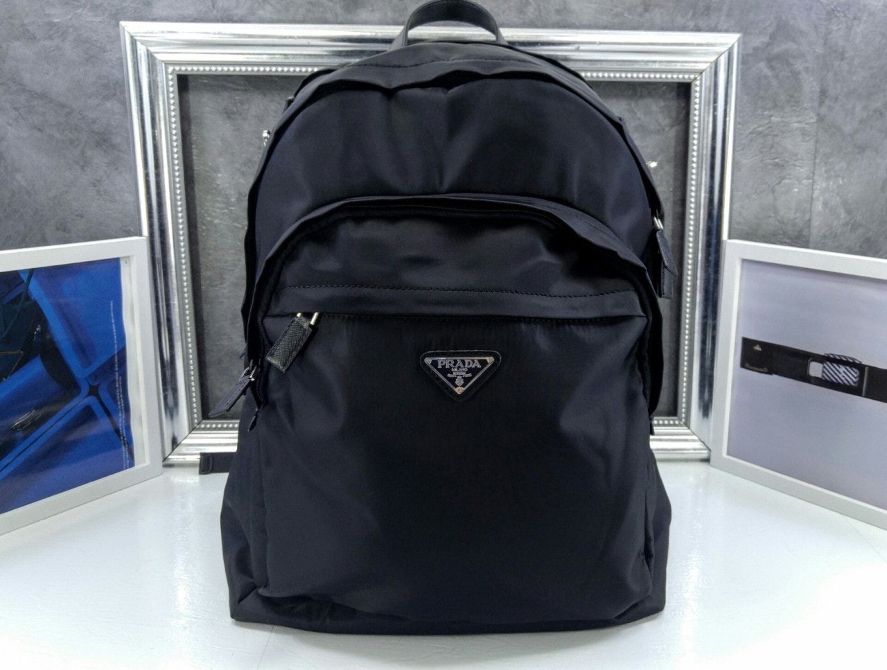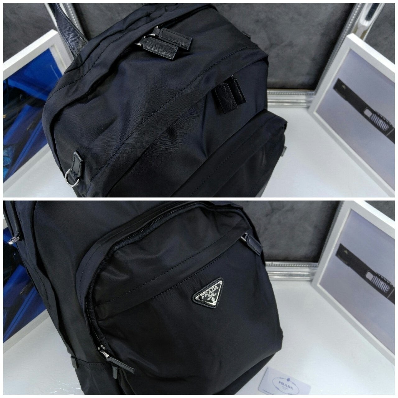 트리밍 및 핸들조절형 나일론 숄더 스트랩패딩이 들어간 기능성 소재 후면유광 스틸 마감 메탈 하드웨어측면에 유광 스틸 마감 메탈 D링지퍼 클로저가 달린 메인 수납공간전면에 지퍼식 외부 포켓나일론 라이닝내부 로고 태그전면 외부에 에나멜 트라이앵글 로고후면에 트롤리용 밴드