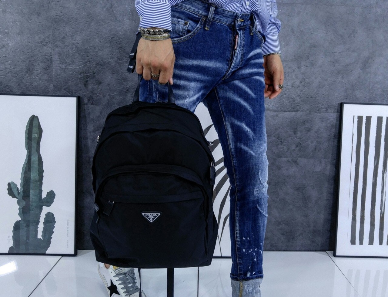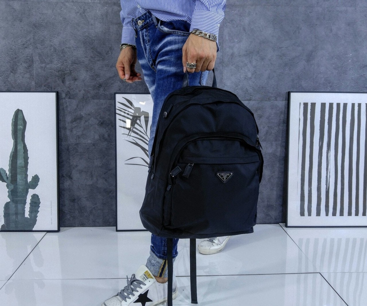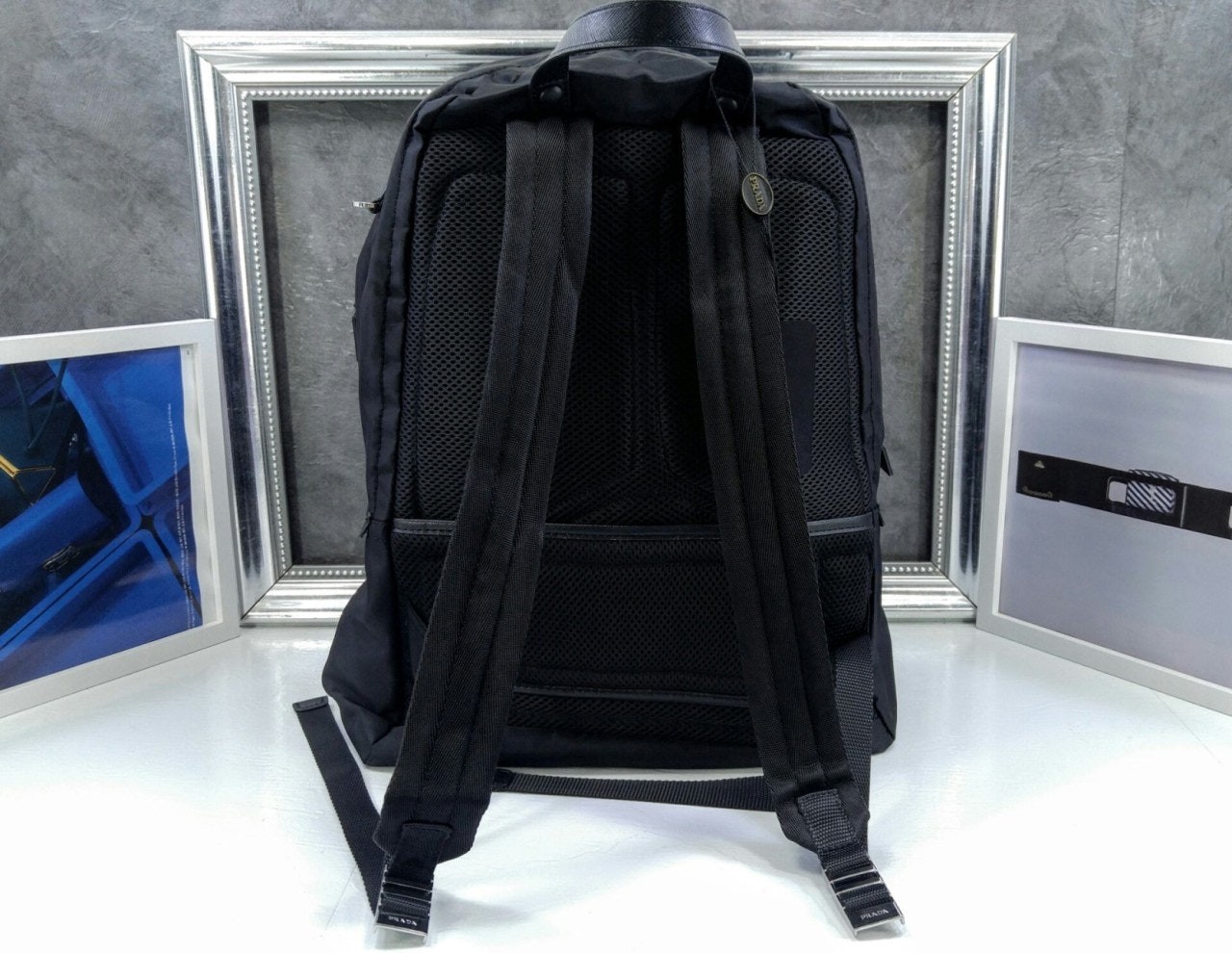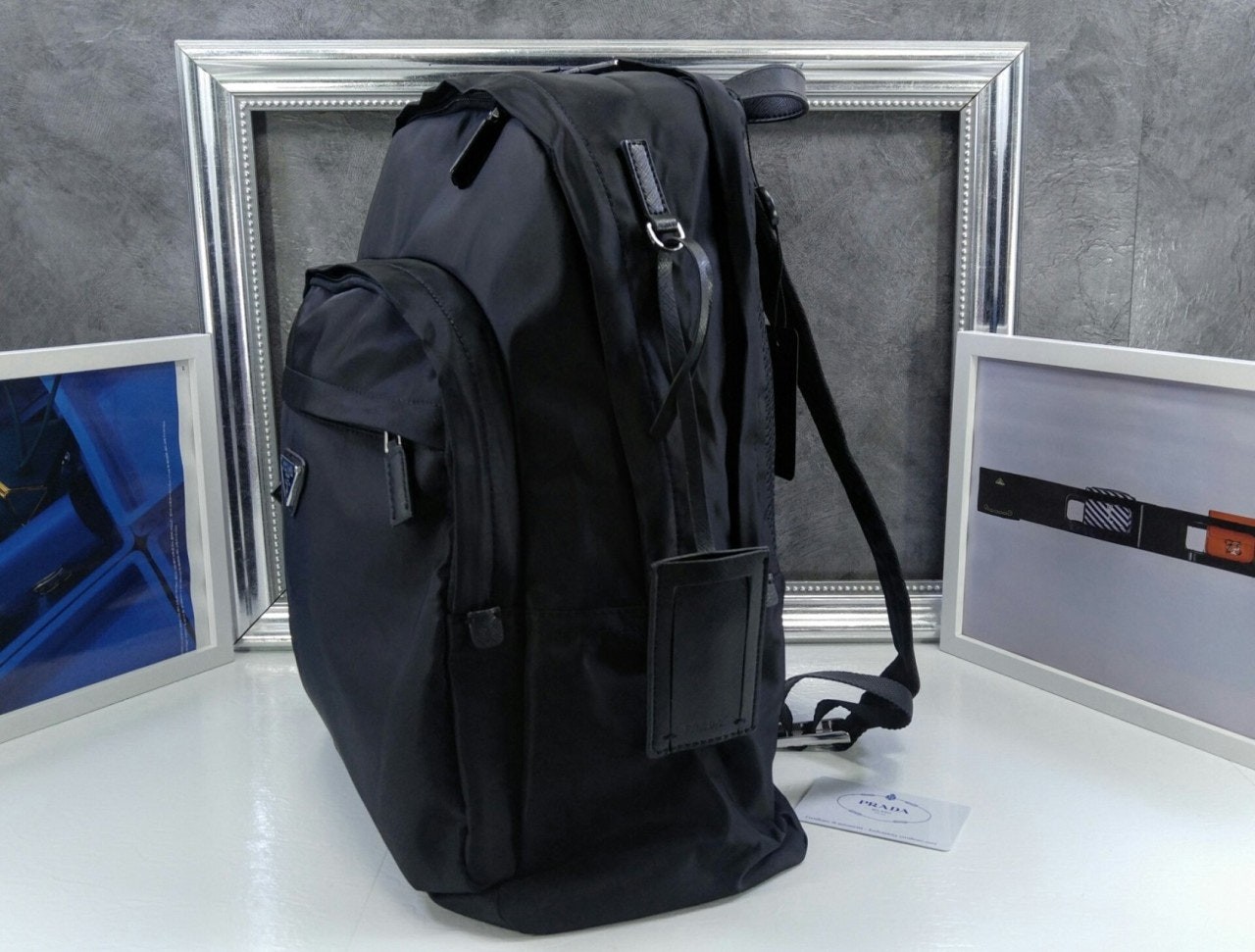 트리밍 및 핸들조절형 나일론 숄더 스트랩패딩이 들어간 기능성 소재 후면유광 스틸 마감 메탈 하드웨어측면에 유광 스틸 마감 메탈 D링지퍼 클로저가 달린 메인 수납공간전면에 지퍼식 외부 포켓나일론 라이닝내부 로고 태그전면 외부에 에나멜 트라이앵글 로고후면에 트롤리용 밴드