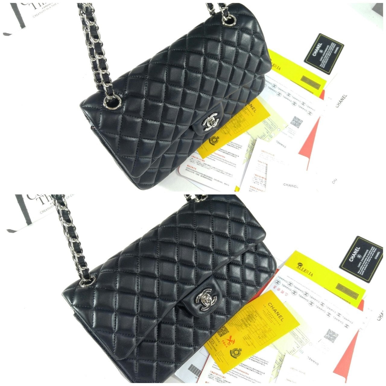 • 샤* 클래식 미듐 플랩백 램스킨 블랙 은장 A01112 풀박스 고급
